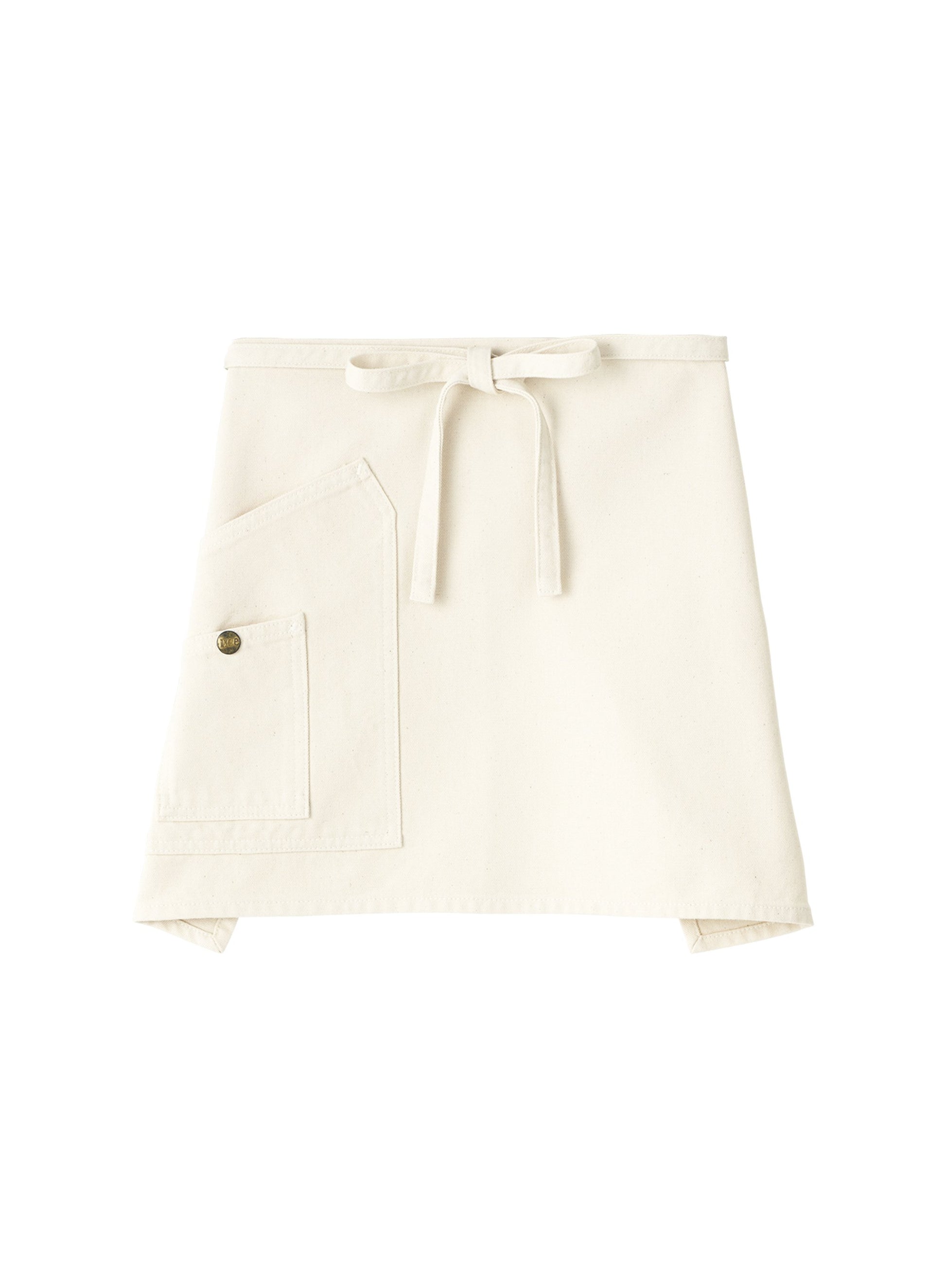 ダブルポケットがアクセントのショート丈のエプロンに、綿100%の風合を生かした新素材がラインナップ。