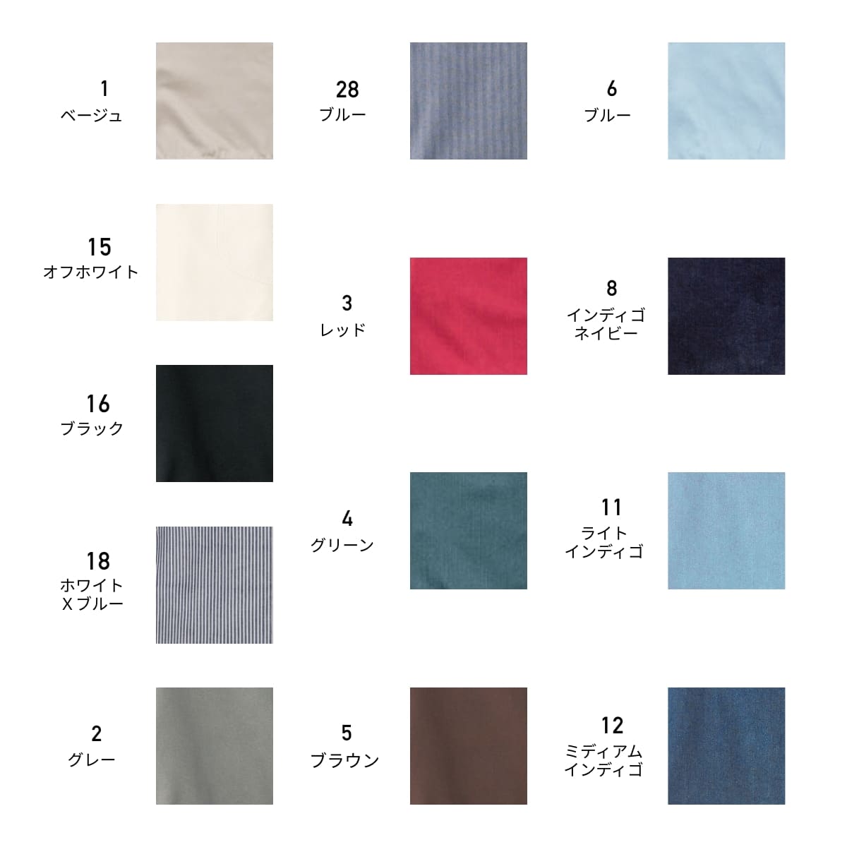 素材:ベージュ、レッド、グリーン、ブルー、インディゴネイビー:ストレッチデニム(綿80%、ポリエステル20%)、 ホワイト×ブルー:ストレッチヒッコリー(綿65%、ポリエステル35%)