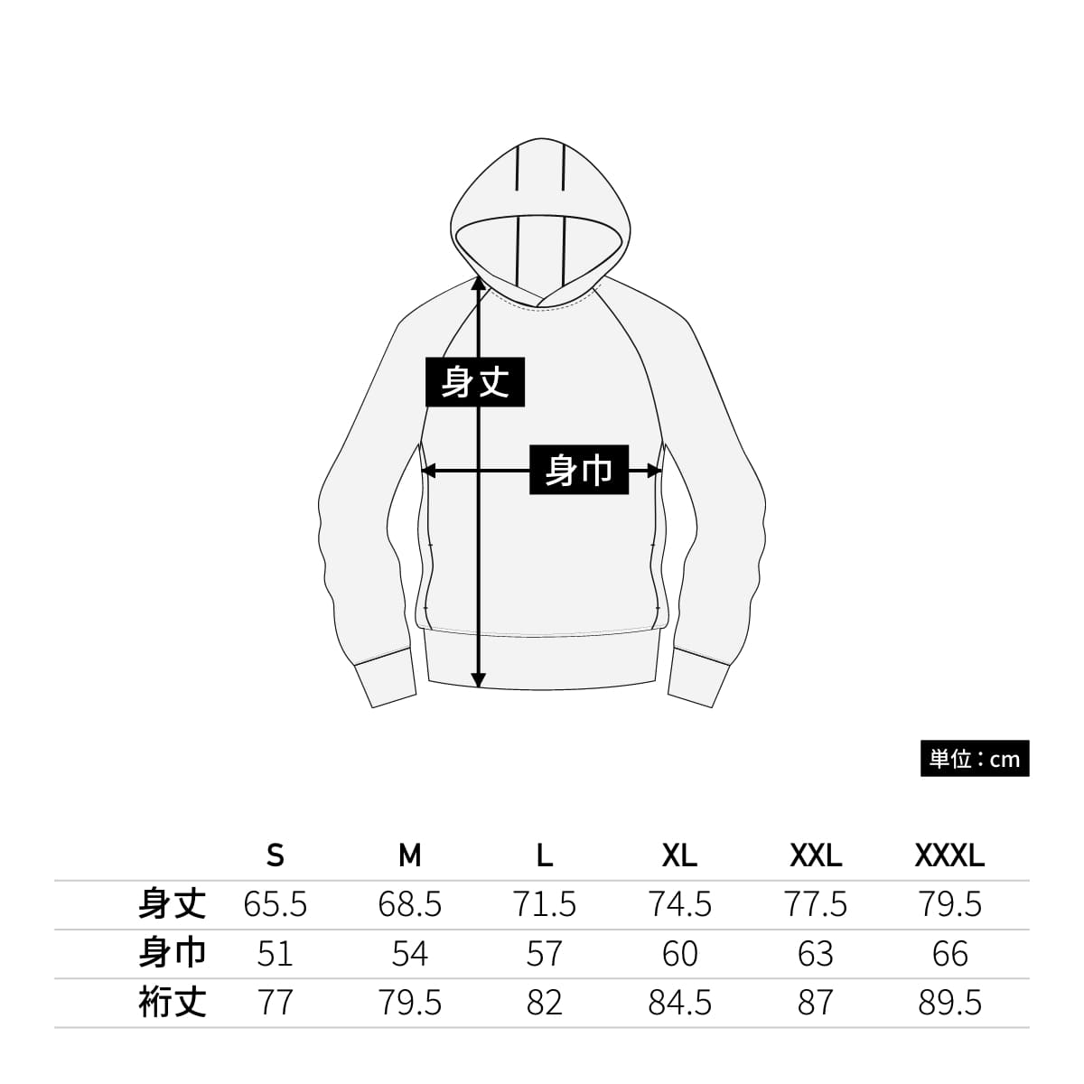 | 身丈 | 65.5 | 68.5 | 71.5 | 74.5 | 77.5 | 79.5 |