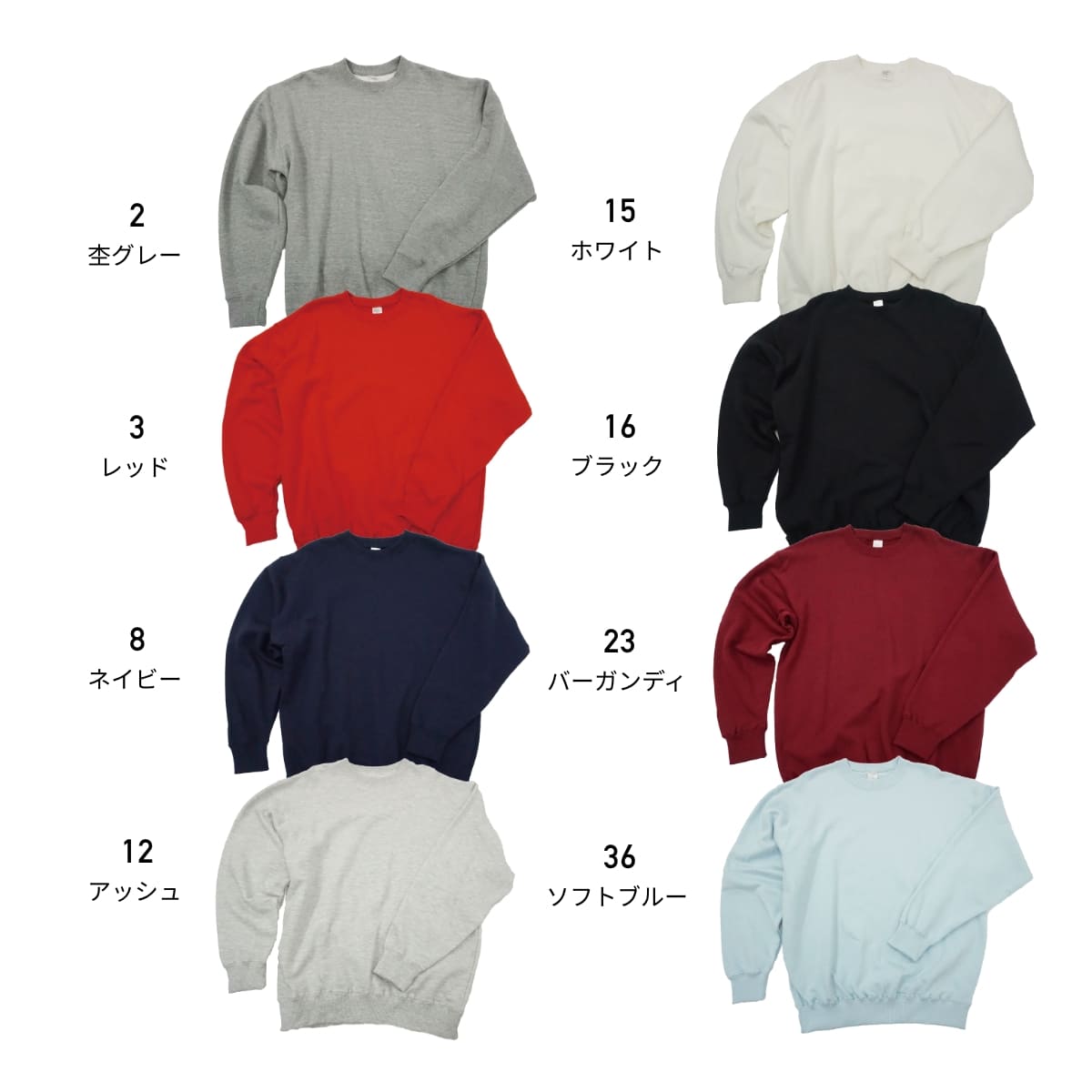 素材:綿100% (杢グレー:綿90%,ポリエステル10%) 裏毛