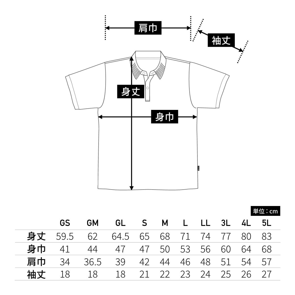 | 身丈 | 59.5 | 62 | 64.5 | 65 | 68 | 71 | 74 | 77 | 80 | 83 |