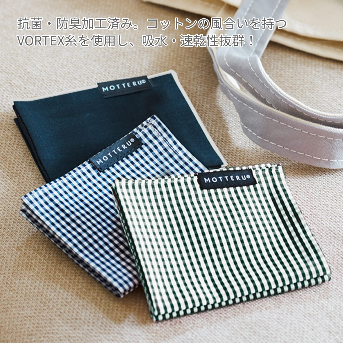 今まで以上に手洗い・うがいが推奨されているコロナ禍において、ハンカチは必需品。毎日清潔にお使いいただけるよう抗菌・防臭・速乾・吸水機能付き。ポリエステル素材でありながらも、コットンの風合いを持つVORTEX(ボルテックス)糸を使用することで、多機能と使い心地を両立させました。
