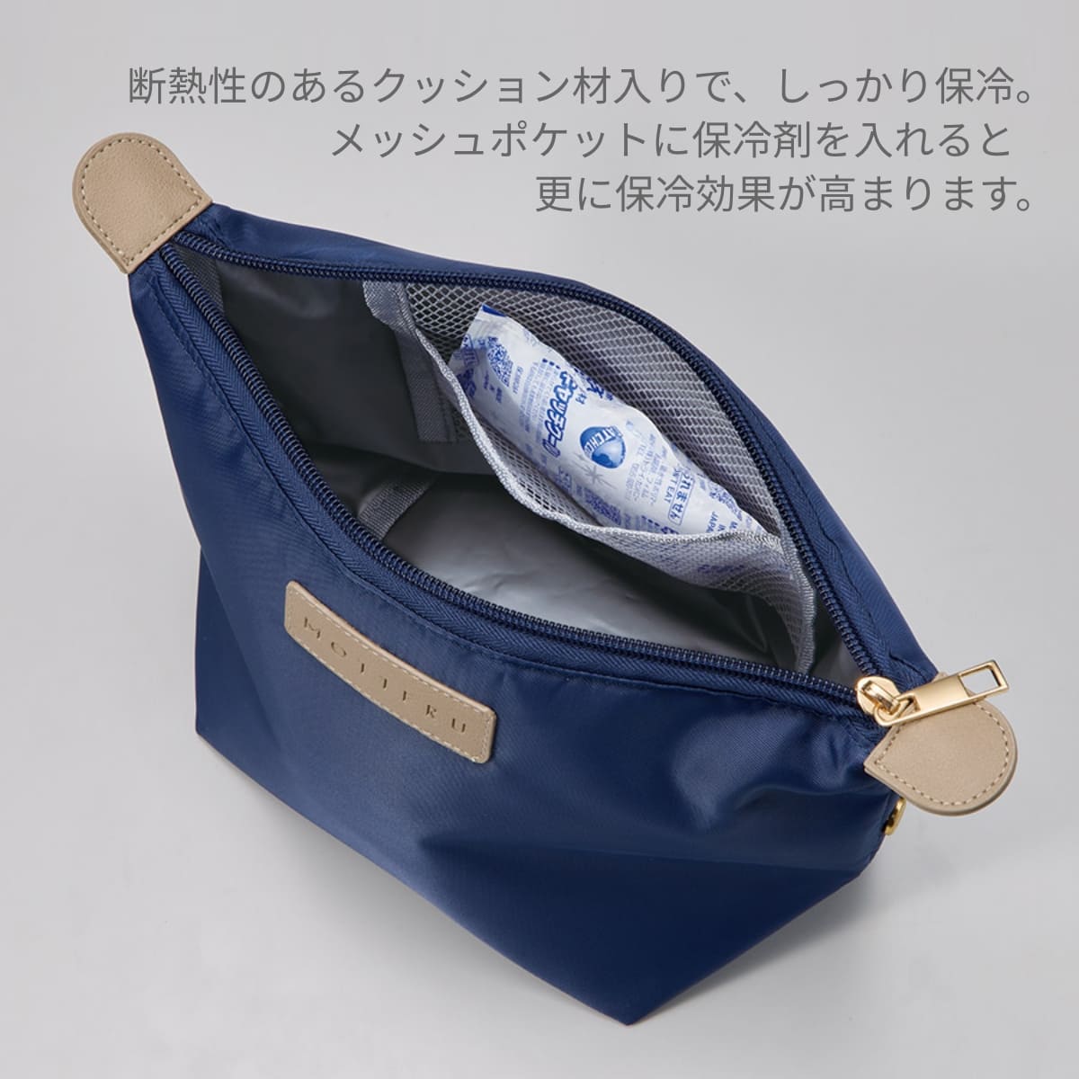 さらに内側にはメッシュポケット付きで保冷剤を入れてご使用いただくことで更に保冷効果を高めてくれます。