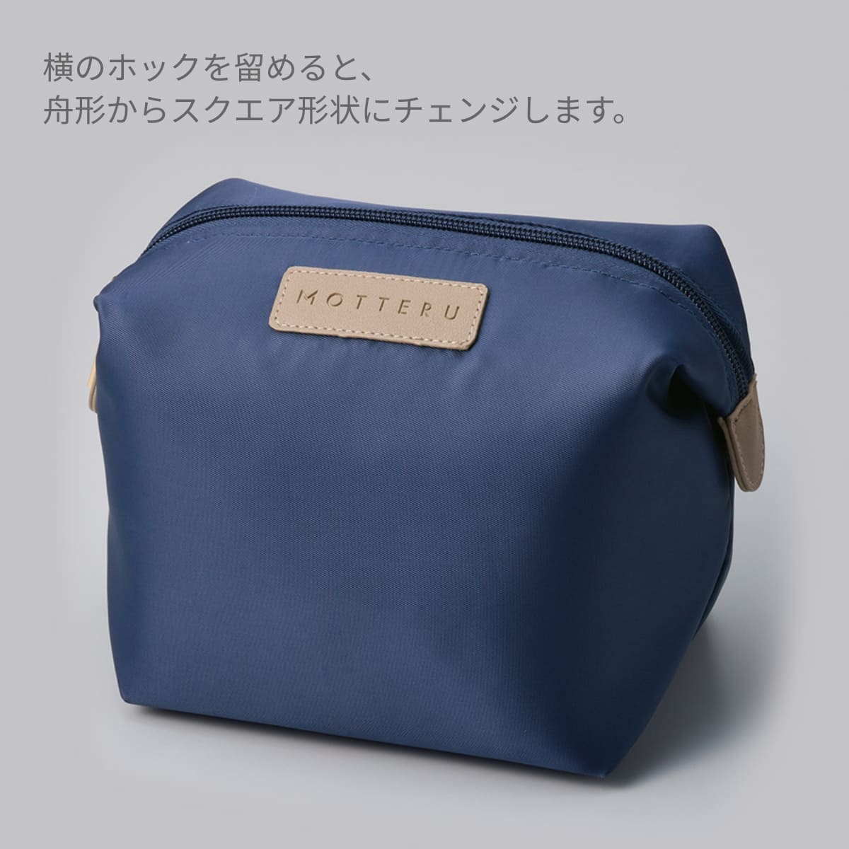 サイドのホックを留めると、舟形からスクエア形状に変化するデザインです。
