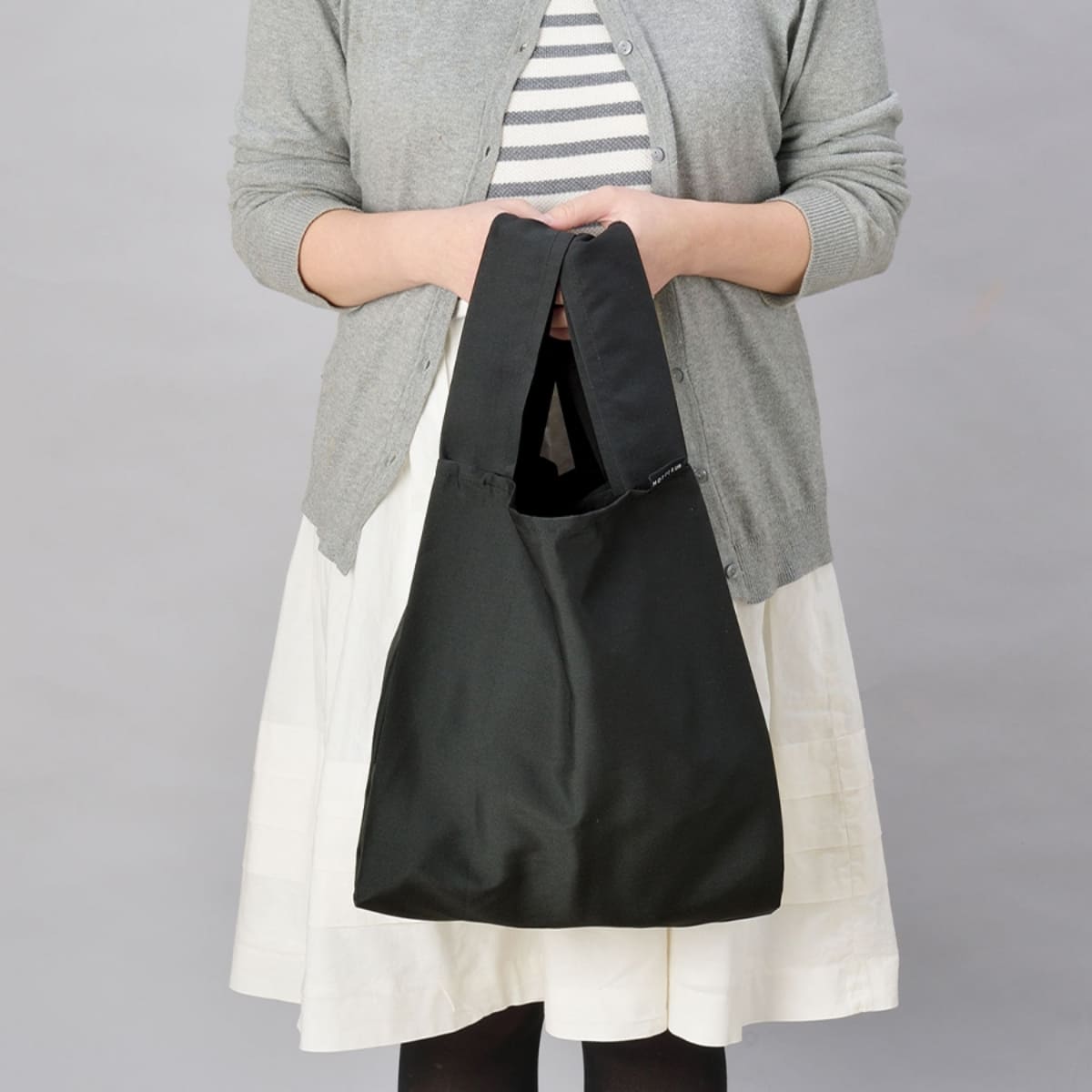 くるりと丸めてゴムバンドでとめると、手のひらに収まるほどのコンパクトサイズで持ち運べるエコバッグです。