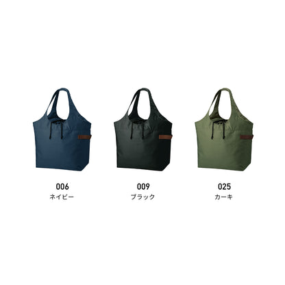 巾着仕様となっている口元は大きく開くことができるので物の出し入れがしやすく、外側についているベルトは車からの荷降ろしや少し手を開けたい時に、傘等を引っ掛けることが出来るなど、機能性にこだわったお買い物バッグです。