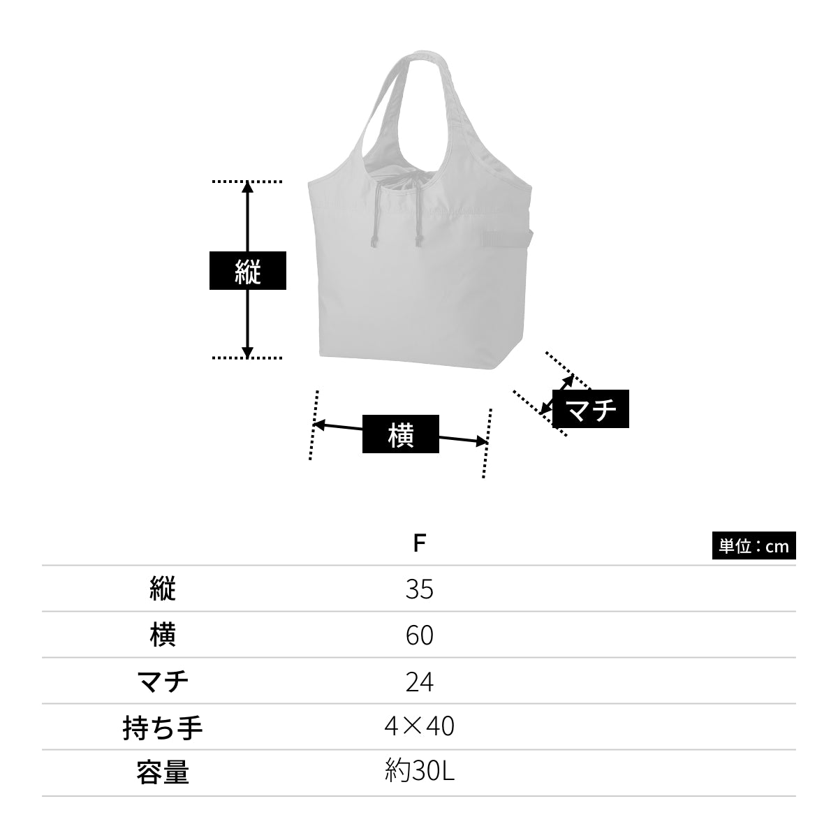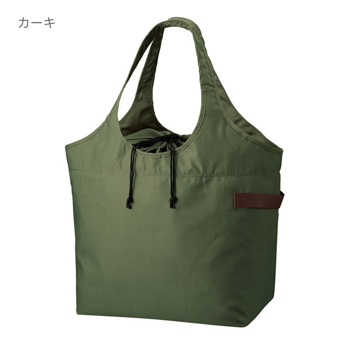 巾着仕様となっている口元は大きく開くことができるので物の出し入れがしやすく、外側についているベルトは車からの荷降ろしや少し手を開けたい時に、傘等を引っ掛けることが出来るなど、機能性にこだわったお買い物バッグです。