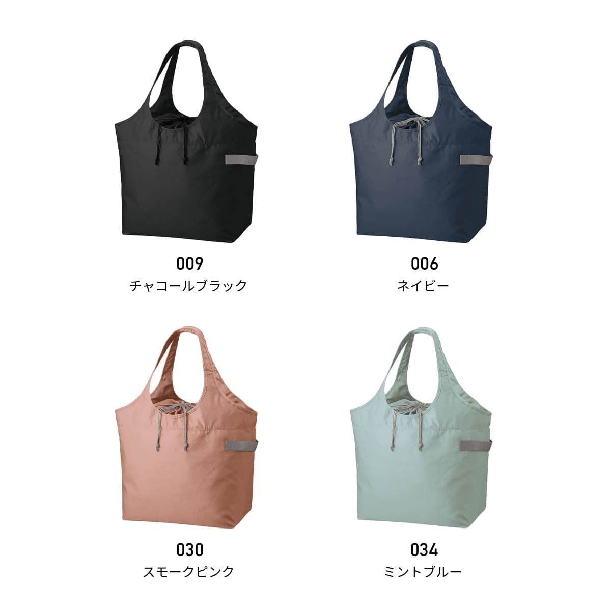 巾着仕様となっている口元は大きく開くことができるので物の出し入れがしやすく、外側についているベルトは車からの荷降ろしや少し手を開けたい時に、傘等を引っ掛けることが出来るなど、機能性にこだわったお買い物バッグです。