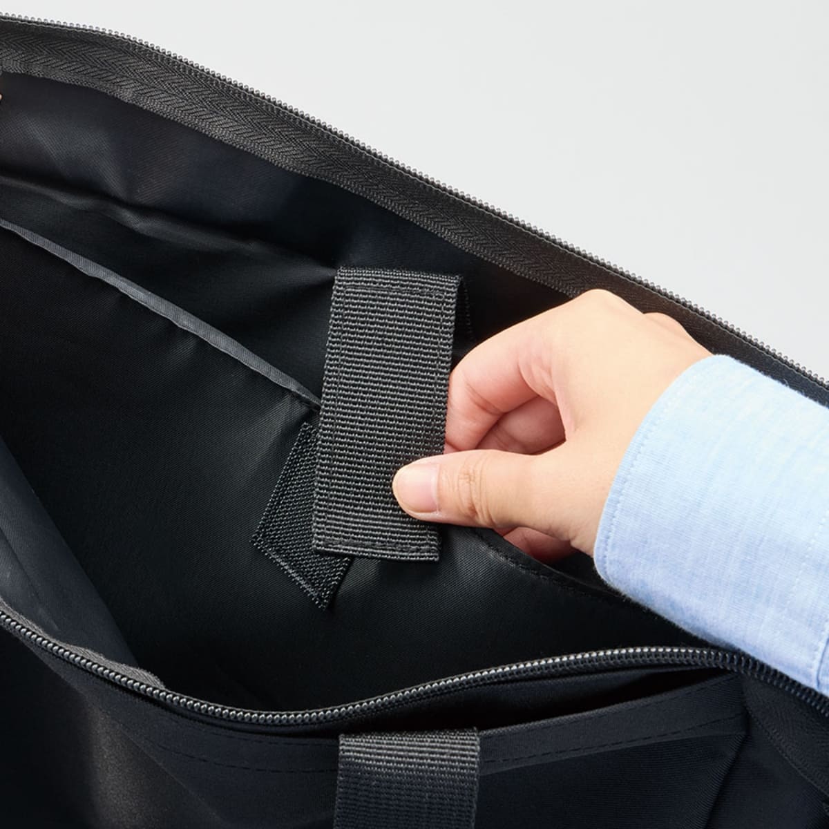 またファスナー付きで、バッグ内の目隠しや雨の侵入を防止することもできます。