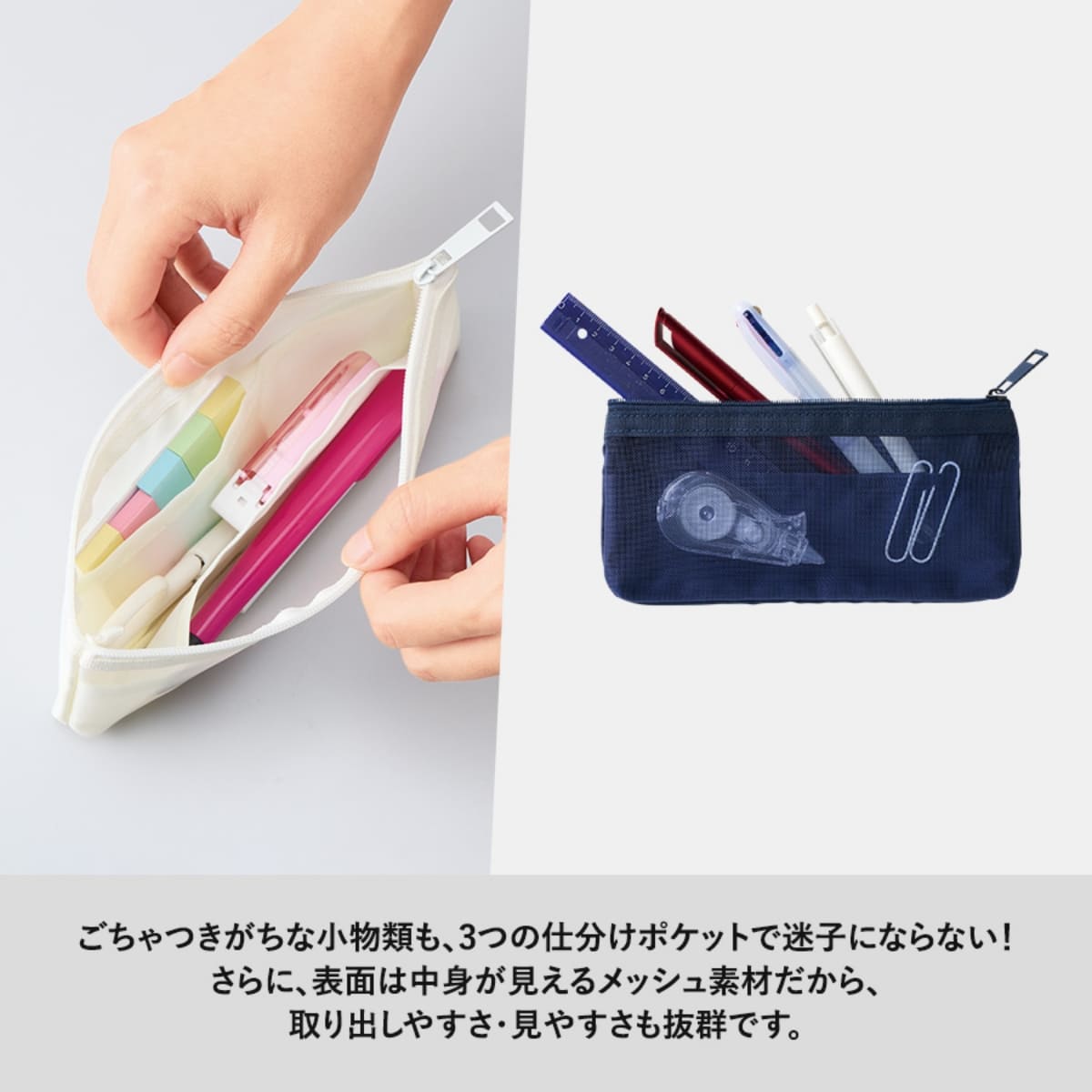 仕分け用ポケット付きで楽に仕分けができるペンケース
