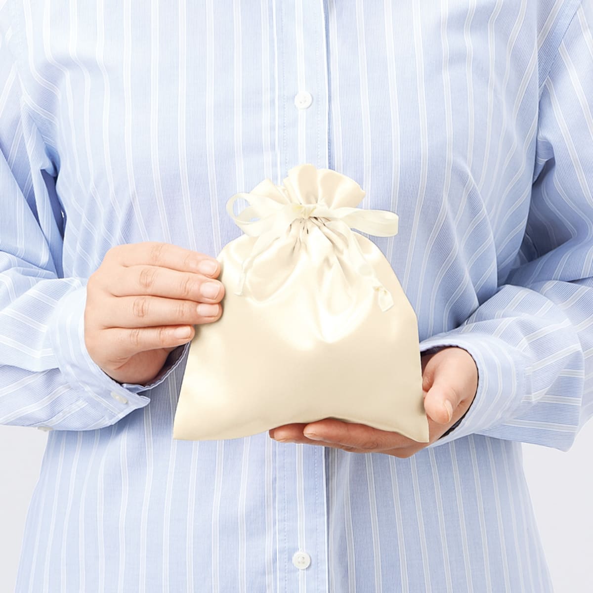 口元はフリル形状、紐部分はサテンリボンを使用しているため