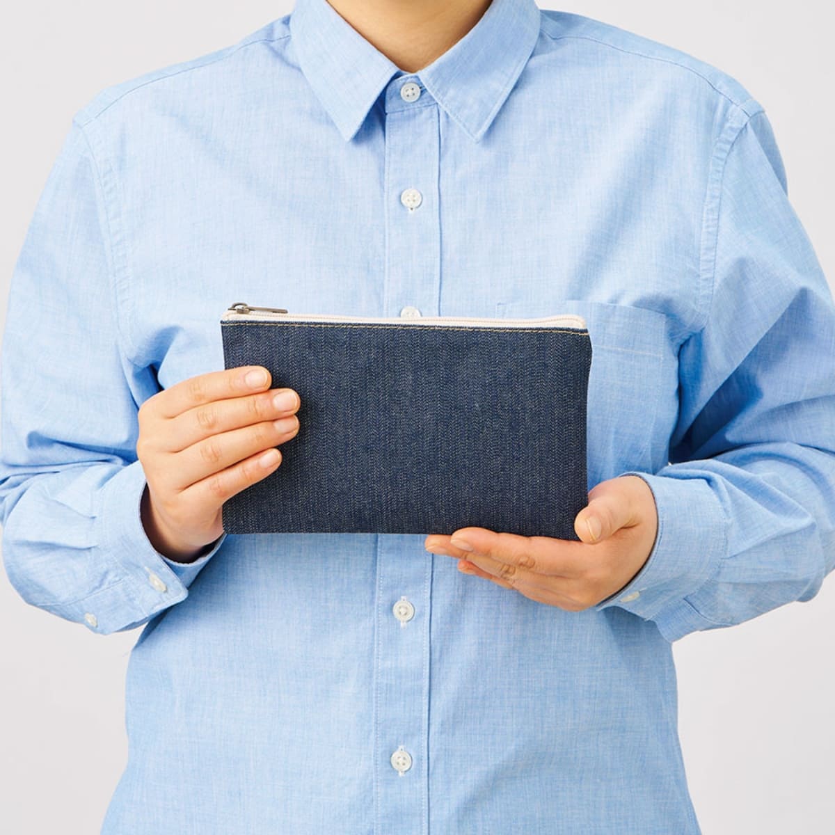 フラットタイプで使いやすい、おしゃれな印象のデニムポーチ