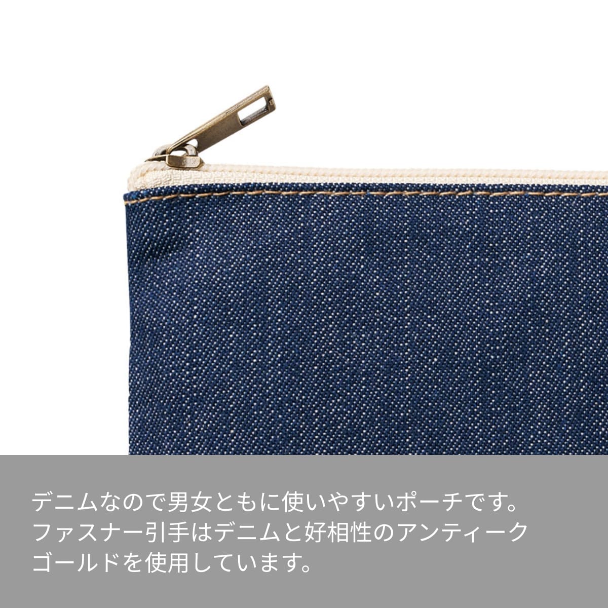 ファスナーの引き手部分はデニムと相性の良い、アンティークゴールドの色味になっています。