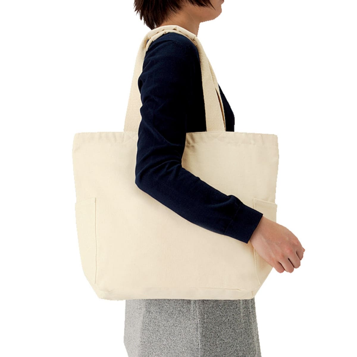 A3サイズもゆとりを持って入れられる厚みのあるしっかり生地のコットントートバッグです。ペットボトル入る便利なサイドポケット付で、肩かけ利用も可能です。アウトドアのご利用や日用使いのトートバッグとしてもおすすめです。物販としてもご利用頂いております。