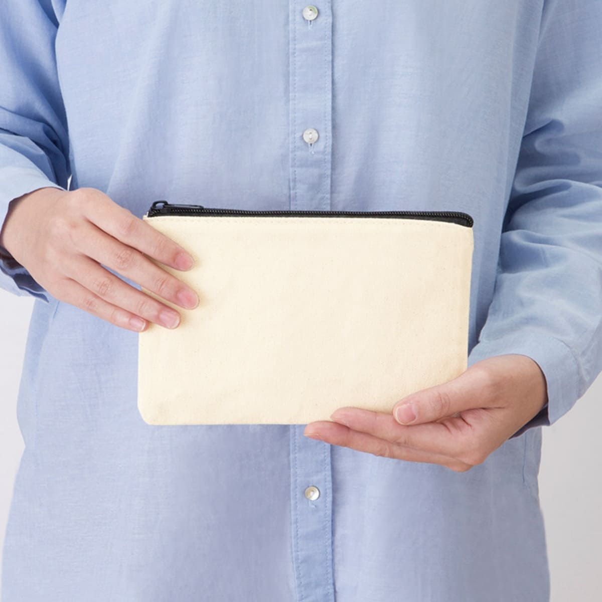 カジュアルなキャンバス生地のポーチです。化粧道具やステーショナリー、カード類の持ち運びにも便利です。