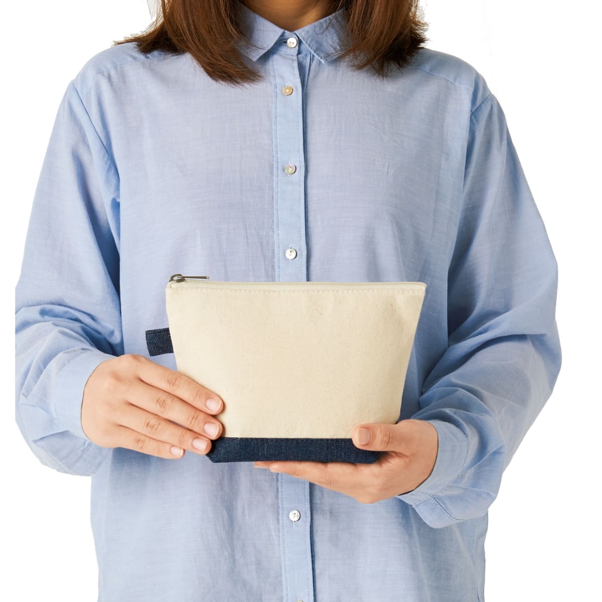 キャンバスとデニムの配色ポーチです。カジュアルなデニムと好相性のアンティークゴールドのファスナーを使用し、男女ともに使いやすいファッショナブルなポーチです。アクセントとしてサイドにデニムのループがついており、ファスナーの開閉がしやすい仕様となっております。底を二重にすることでしっかりと自立するので、コスメ用からトラベル用まで幅広いシーンでお使い頂けます。