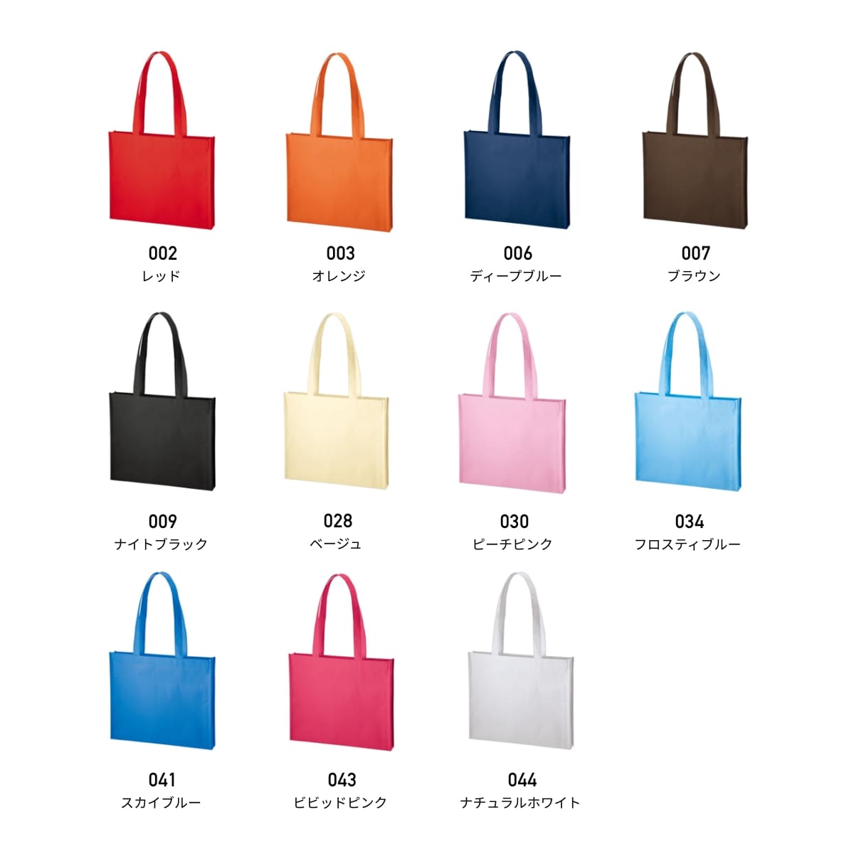 スリムな横型の不織布バッグです。持ちやすいようにサイズは少し小さめにしており、ショルダーを長めにすることで肩からかけやすい仕様になっております。マチのサイズもスリムにしているので、書類を入れるのにも適しています。展示会やオープンキャンパスでの配布用のバッグとしておすすめのアイテムです。