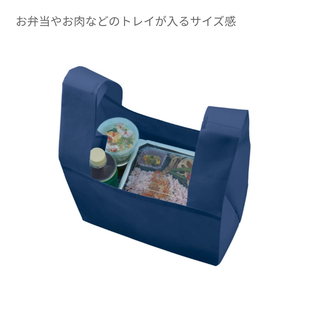 レジ袋の代わりとしてお使い頂ける不織布のエコバッグです。お弁当やお肉などのトレイが入るサイズ感となっており、折りたたんでバッグに入れてもかさばらない不織布の生地を使用しております。店舗のオリジナルエコバッグや観光地のお土産用のバッグなどにおすすめです。