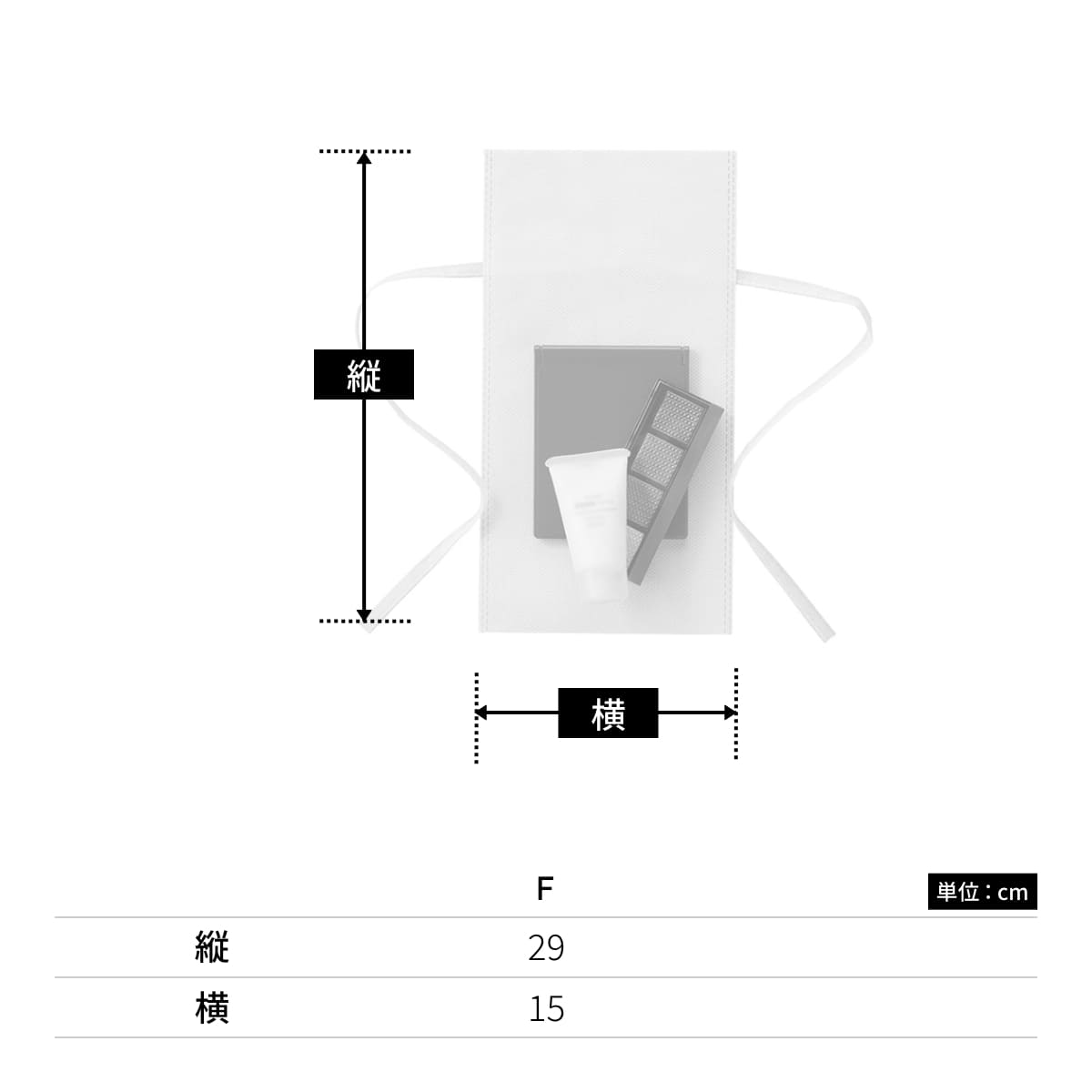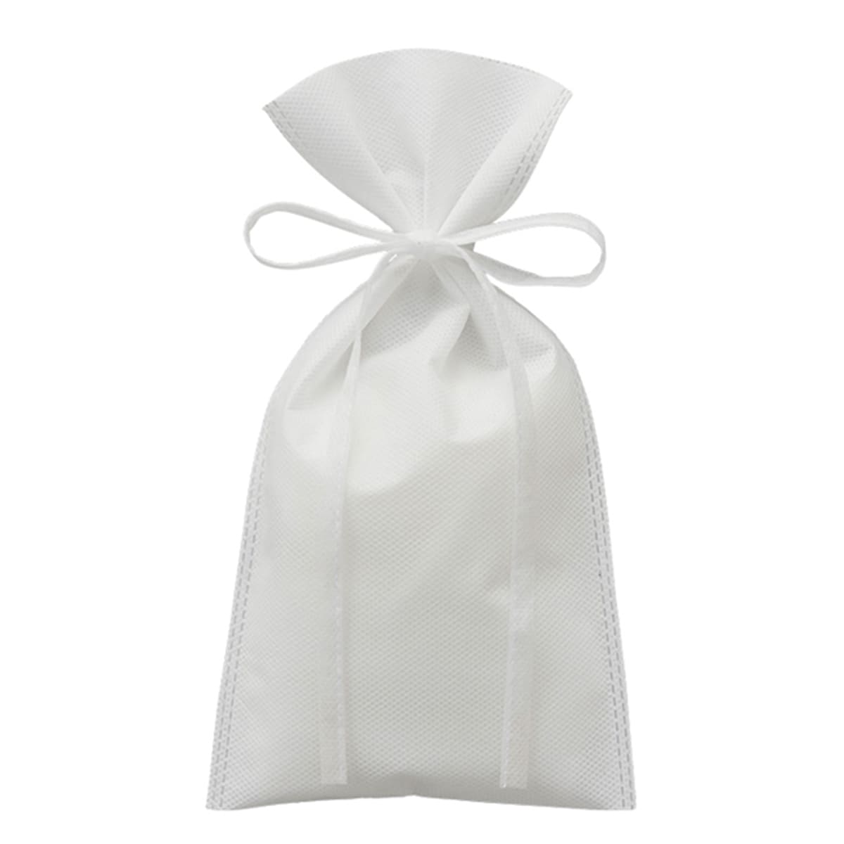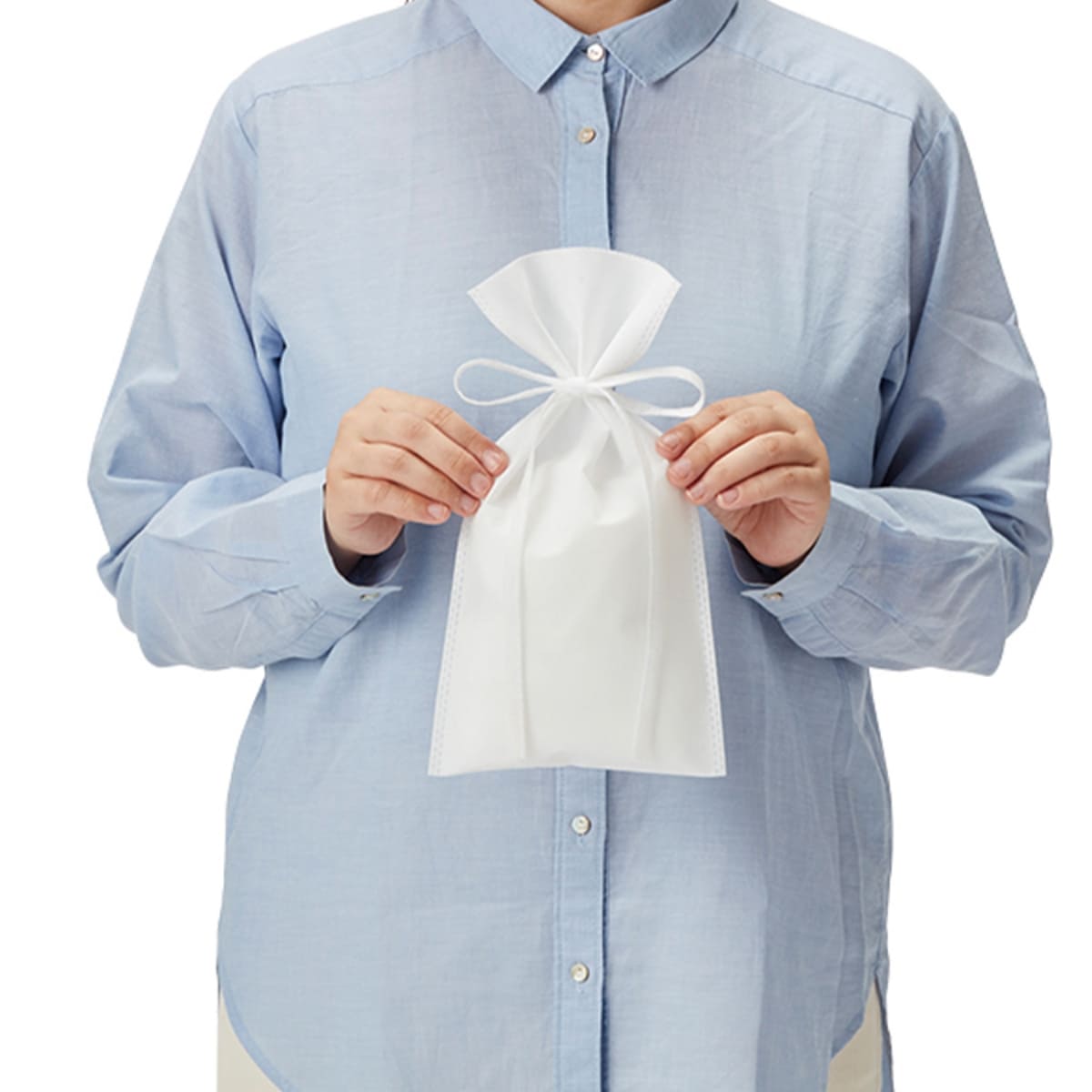 巾着紐をリボンとして結べるようにした不織布巾着です。ギフトやパッケージなどの包材向けにおすすめ。本体は縦長なのでミニボトルなども入る使いやすい形です。クチも大きいので、ミラーや化粧品などの小物も出し入れしやすいです。