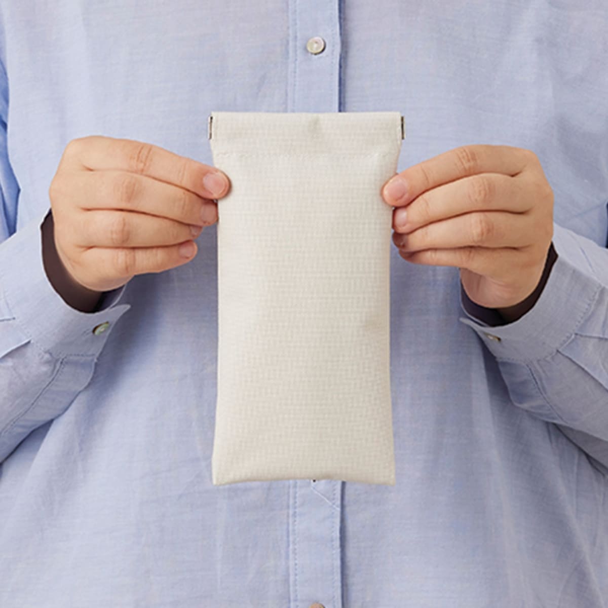 片手でパカッと開けやすい「バネ口金」を使用したポーチです。ユーティリティ生地を使用し、ユニセックスで使えるようなデザインとなっています。メガネケースやペンポーチにぴったりの大きさとなっております。