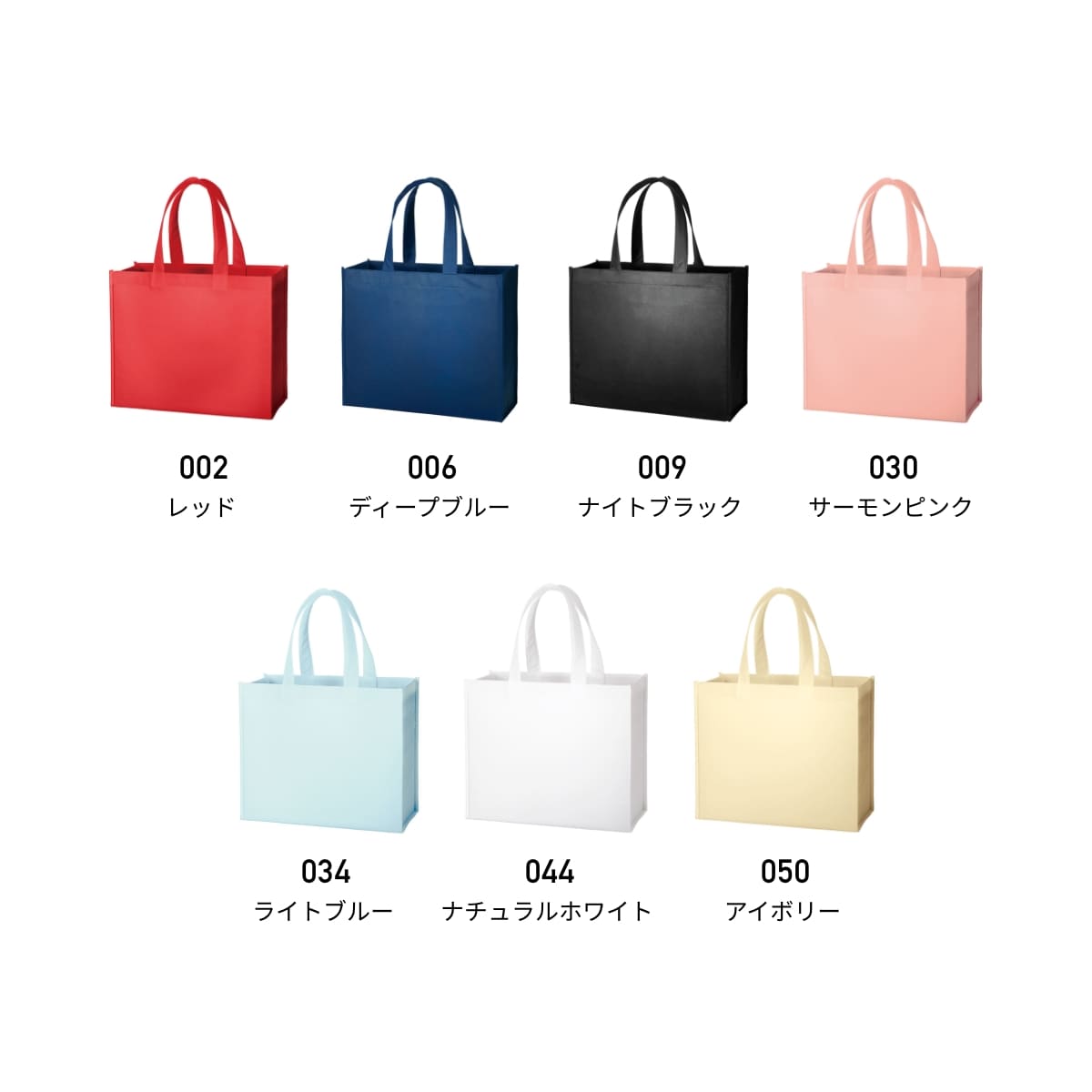エコマーク認証付きの再生不織布を使用したトートバッグです。定番の不織布スクエアトートと同形状・同サイズとなります。横型形状の広いマチ付タイプでA4サイズもゆとりを持って入れられます。展示会やオープンキャンパスなどで利用する配り物用トートなど書類を入れる際に便利です。