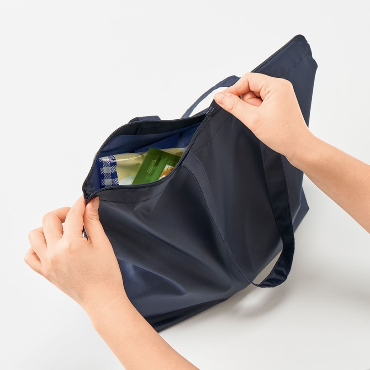 たくさんお買い物をしたときや、荷物が多いときにもファスナーを閉めれば、