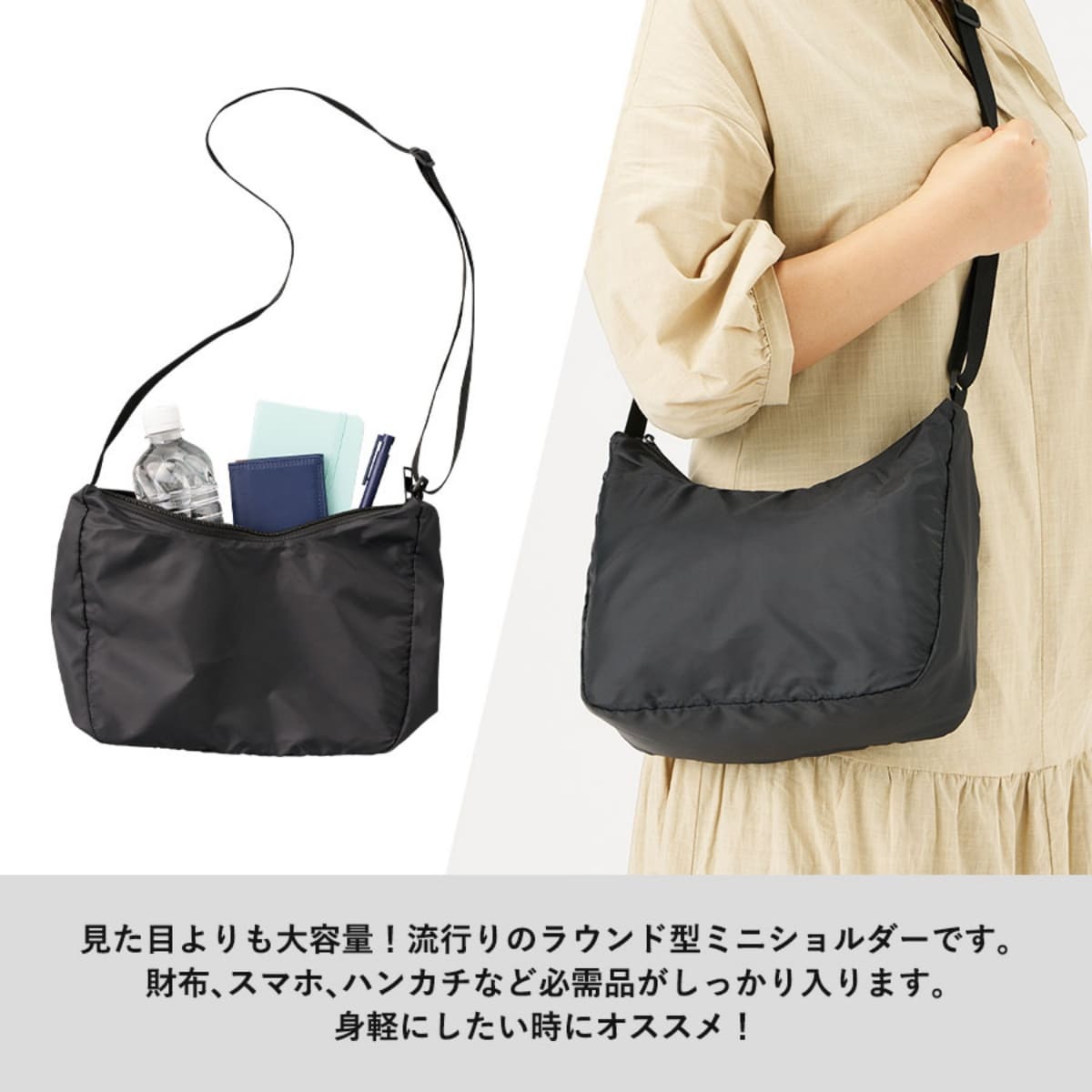 見た目以上の大容量で、財布・スマホ・ハンカチなど身の回りの必需品がしっかり入ります。
