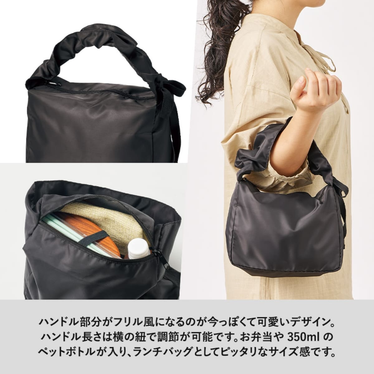 お弁当や350mlのペットボトルが入るサイズでランチバッグとしてぴったりです。