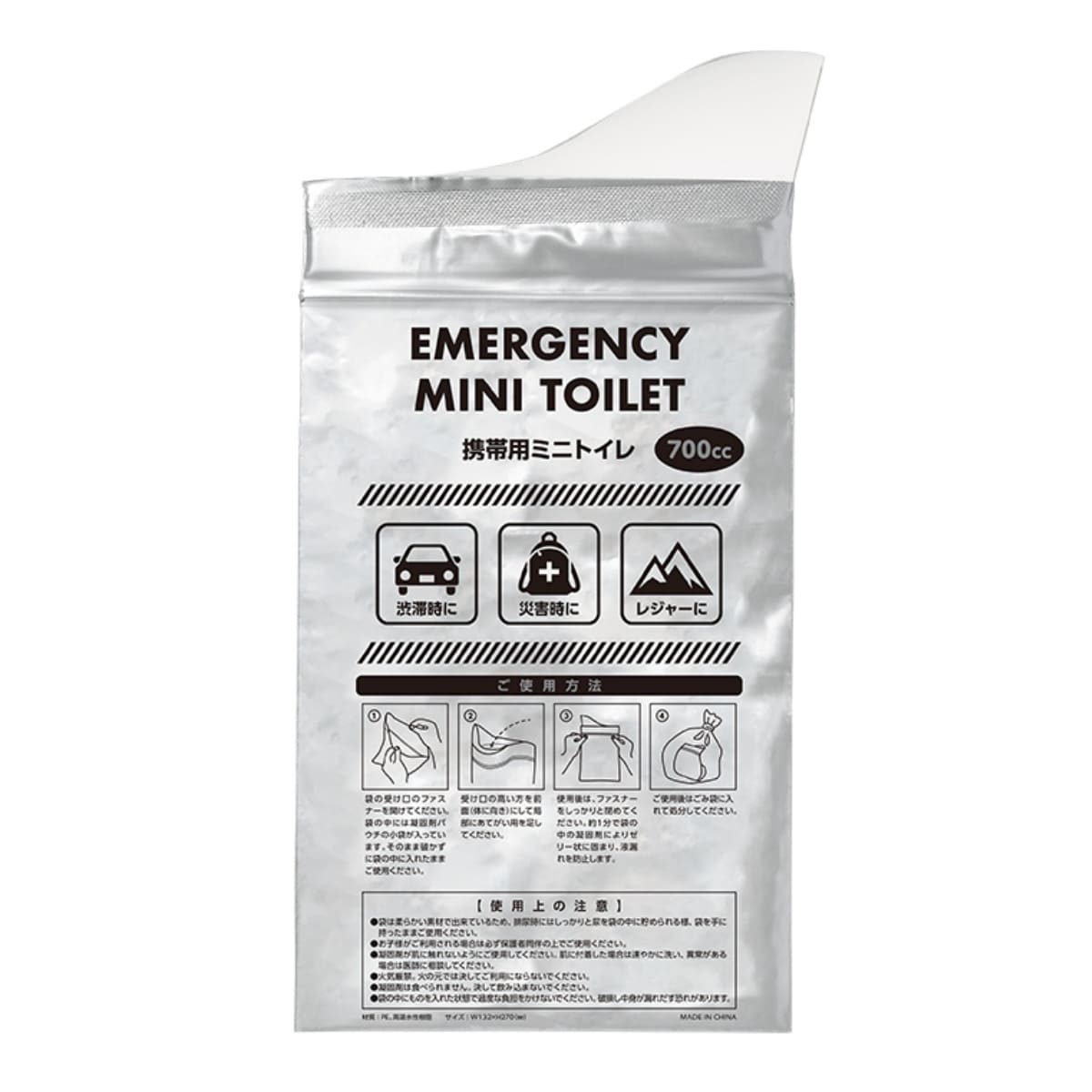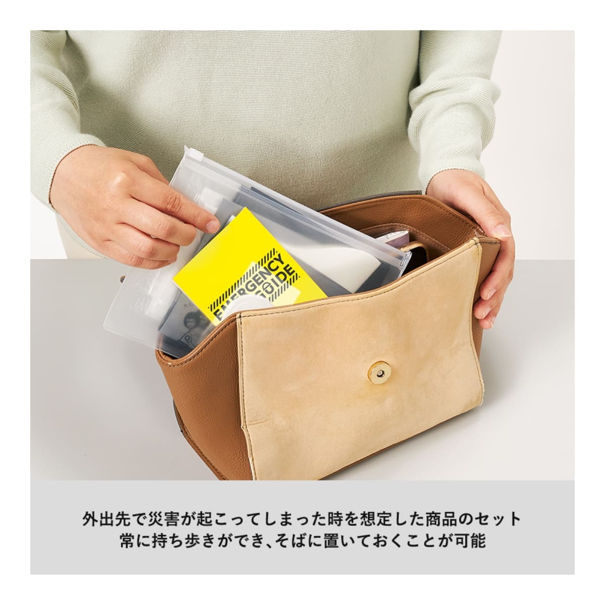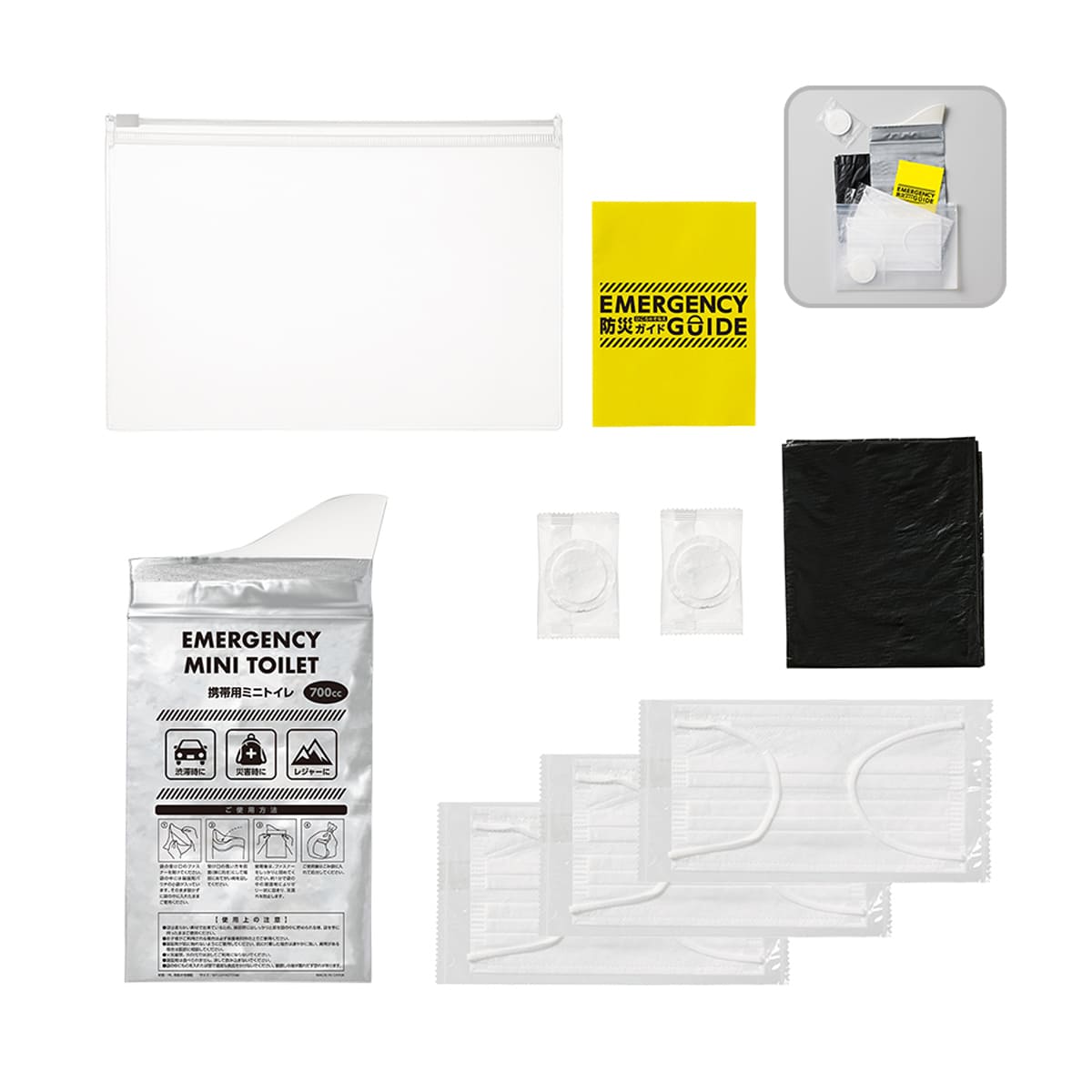 コロナ後では必需品になったマスクをはじめ、緊急時の排尿の際に使える携帯トイレ、水に浸すと簡単に戻せる圧縮タオル、さまざまな用途に活用できるごみ袋といった外出先で災害が起こってしまった時を想定した商品が入っています。