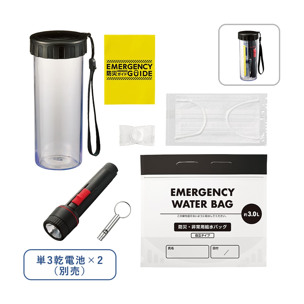 災害時に欠かせない防災グッズ7点をボトルにひとまとめに揃えたセット