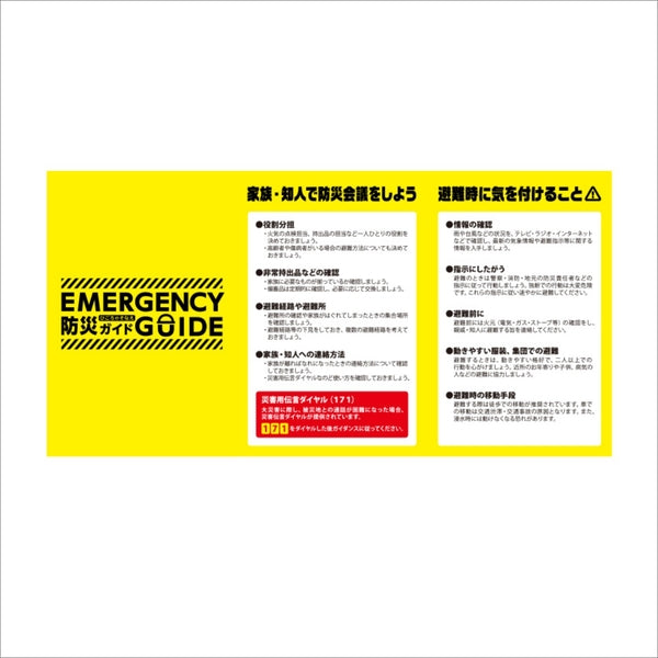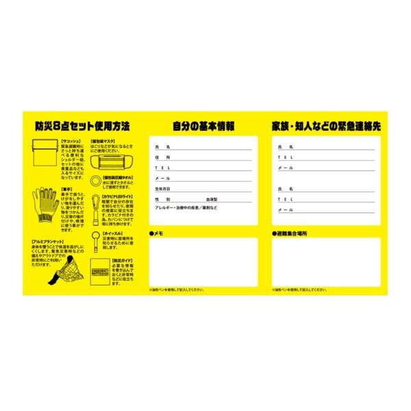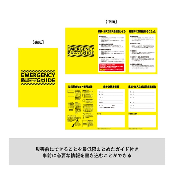 ・軍手・個包装圧縮タオル・個包装マスク×2pcs・防災ガイド