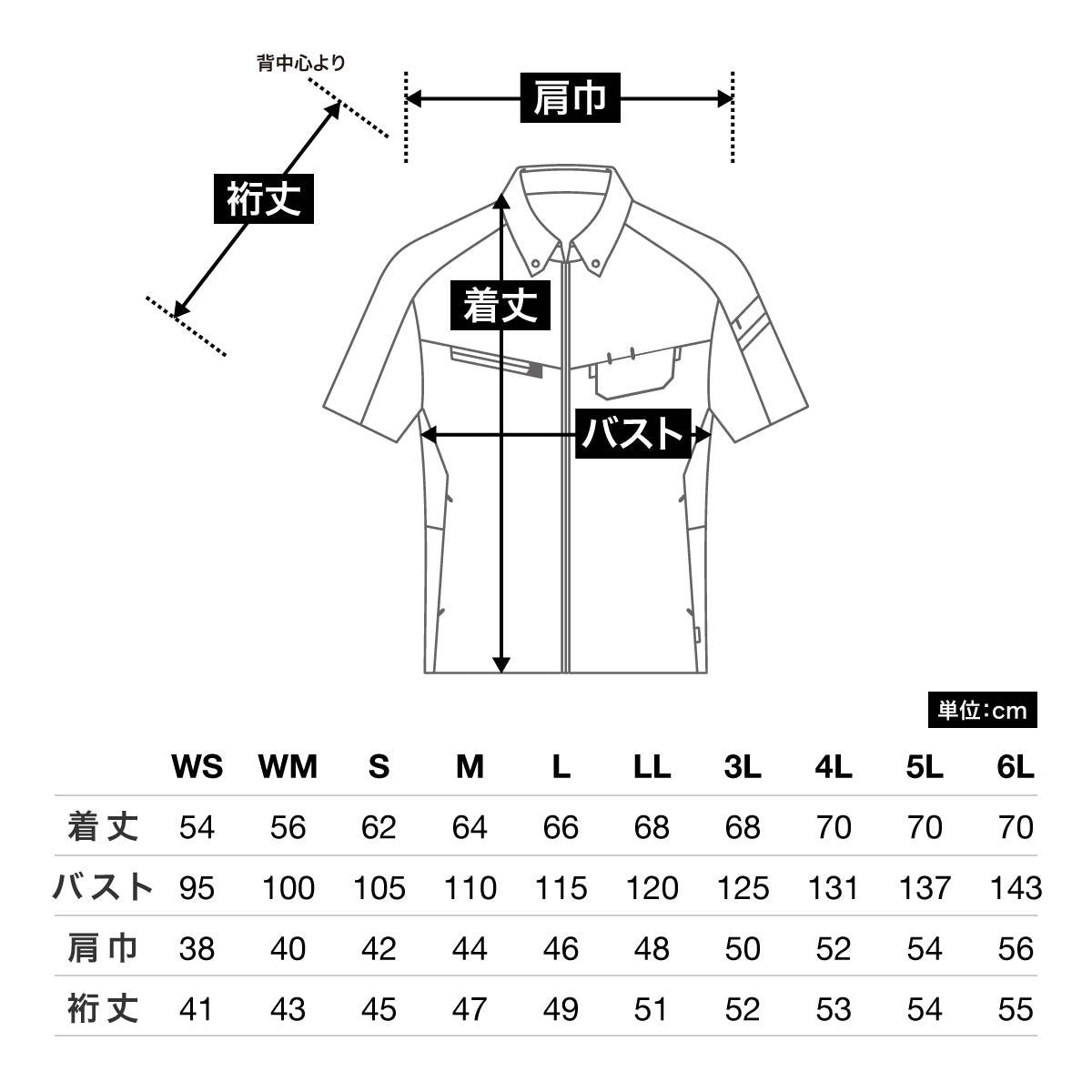 | 着丈 | 54 | 56 | 62 | 64 | 66 | 68 | 68 | 70 | 70 | 70 |
