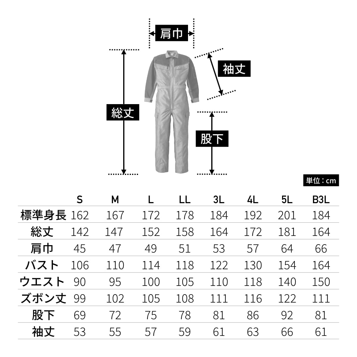 | 総丈 | 142 | 147 | 152 | 158 | 164 | 172 | 181 |