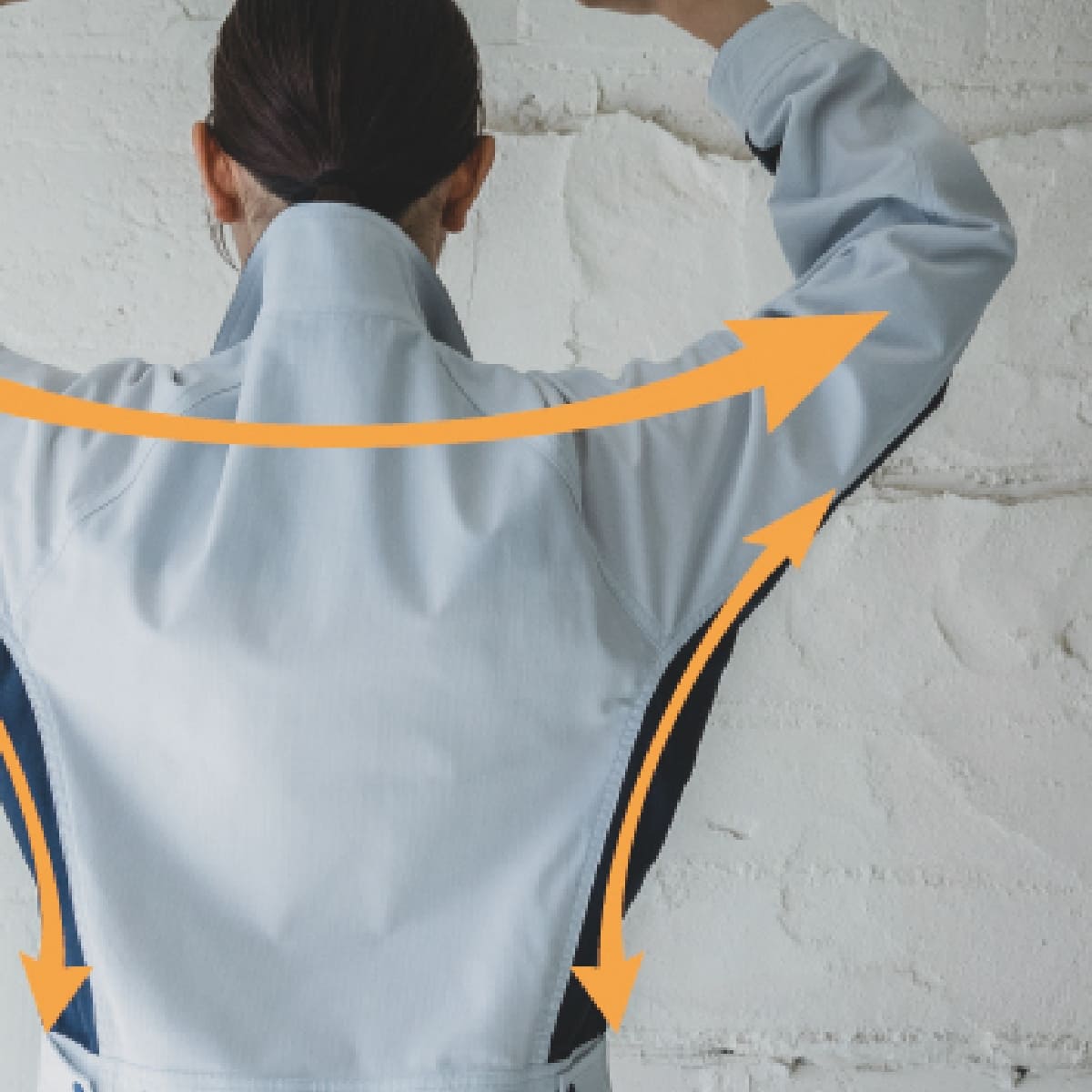 ノーフォークなしで、前方・上方の腕の動きがスム ーズ。その仕掛けは主に バックスタイルにあり。「フロントキッチリ、バックノビノビ」後身頃と機能的なラグラン袖、脇から袖下のパーツをストレッチ方向に裁断する事により、左右 の袖口から袖 口まで、ウエストから脇や袖口まで、一気にグーンと伸びる設計。 ツッパリストレスからの解放感。