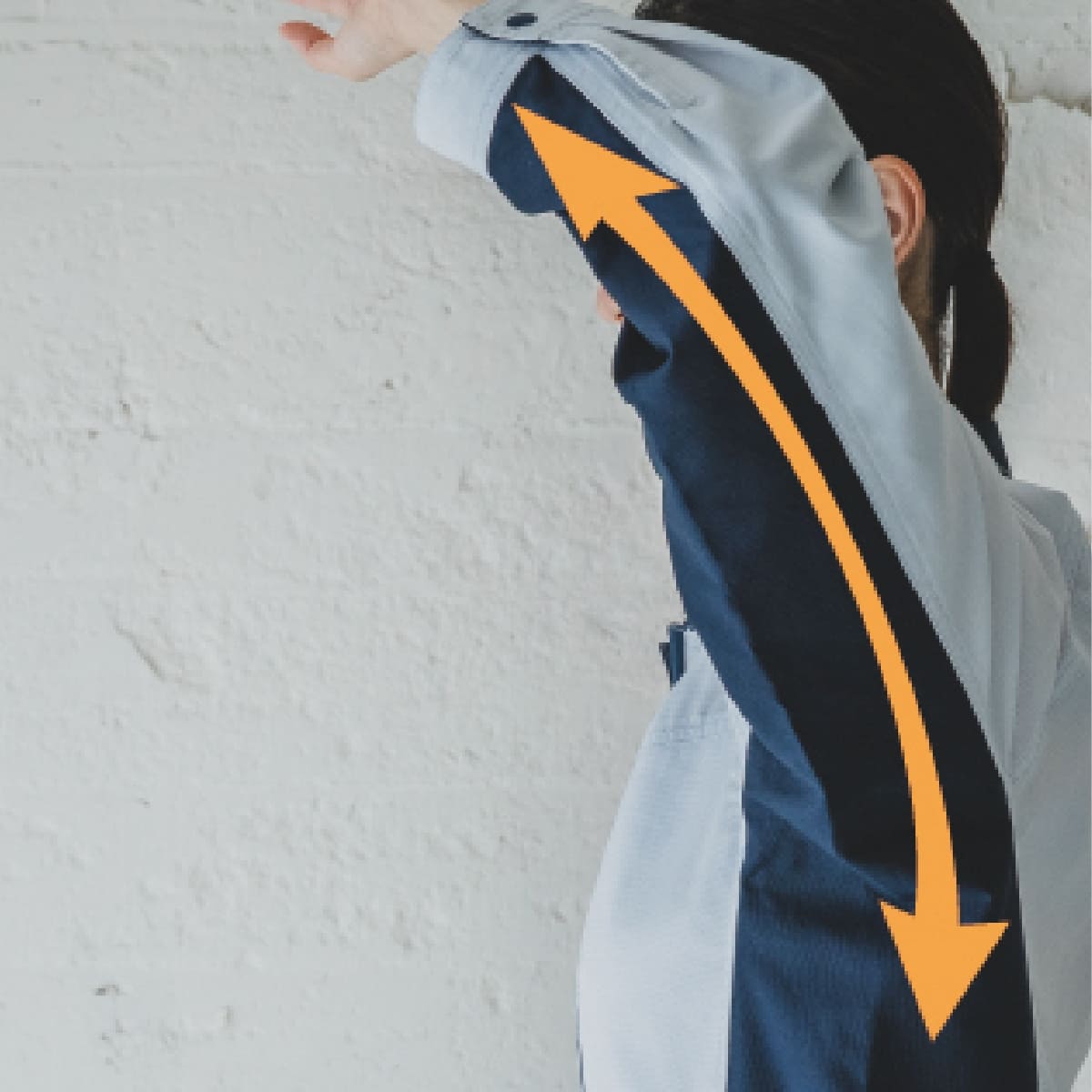 ノーフォークなしで、前方・上方の腕の動きがスム ーズ。その仕掛けは主に バックスタイルにあり。「フロントキッチリ、バックノビノビ」後身頃と機能的なラグラン袖、脇から袖下のパーツをストレッチ方向に裁断する事により、左右 の袖口から袖 口まで、ウエストから脇や袖口まで、一気にグーンと伸びる設計。 ツッパリストレスからの解放感。
