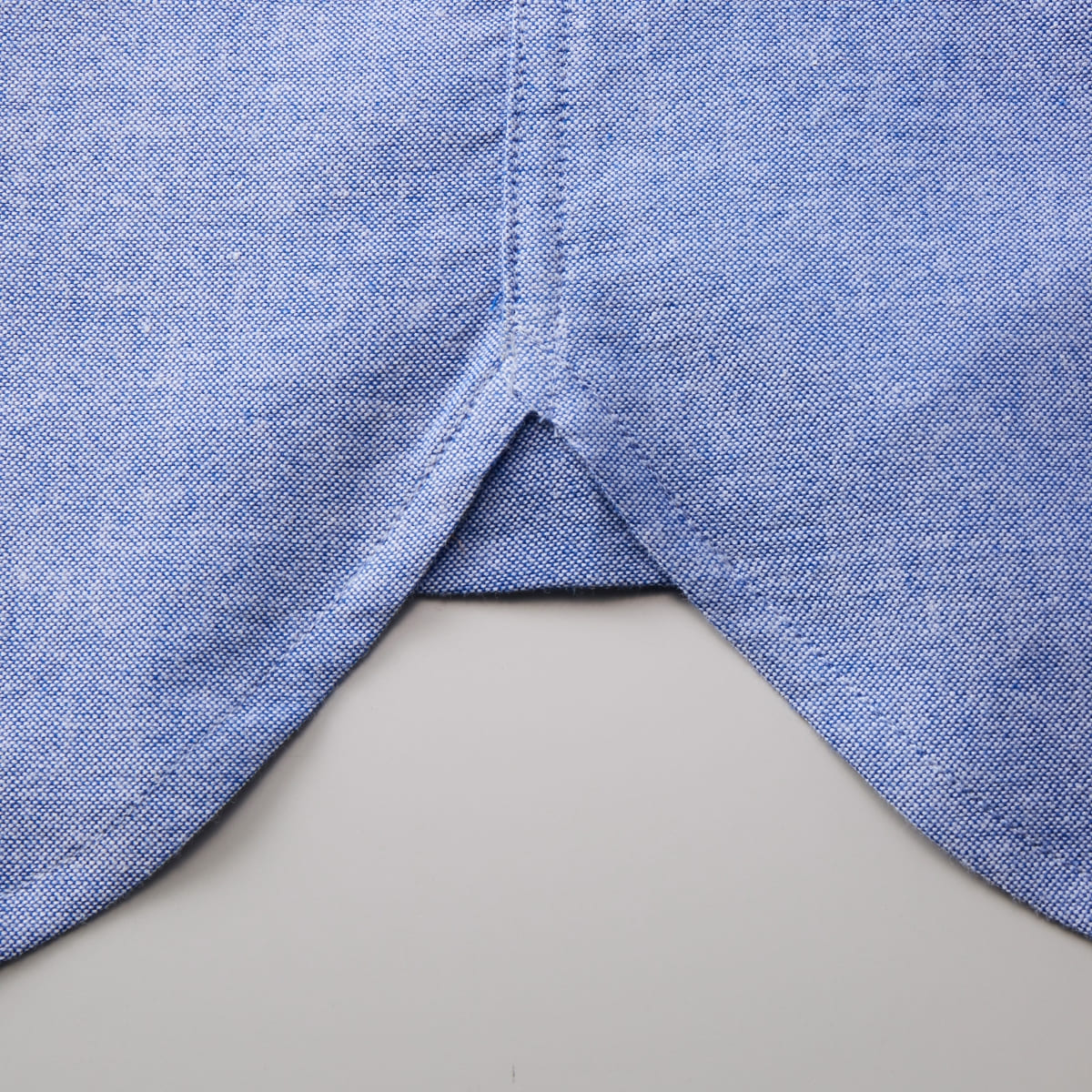ほつれを防ぐ裾ガゼットや、腕を動かしやすくする背面のサイドタック、ズレやかけ違いを防止する横開きのボタンホール(一番下)など、クラシカルな縫製仕様が特徴です。ハリのある生地感なのでインナーが透ける心配がないのも嬉しいポイント。仕事とプライベート、どちらのシーンにもマッチする万能シャツです。