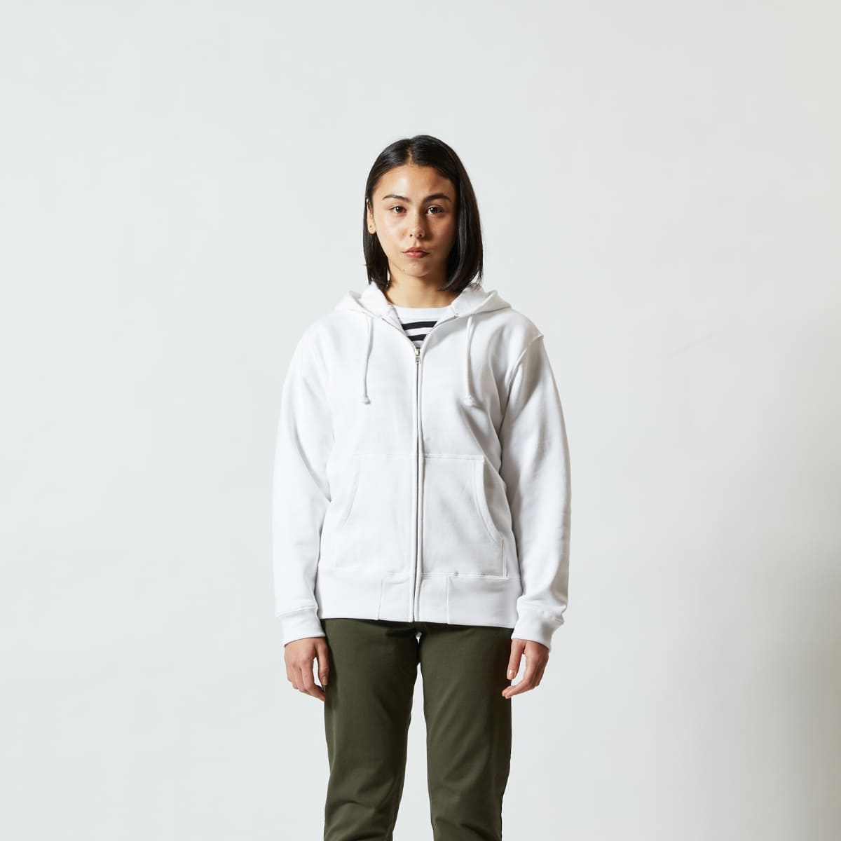 ジップパーカーは前を開けて着るか、閉めて着るかによっても印象が異なります。(半開きで着るというスタイルもありますね!)