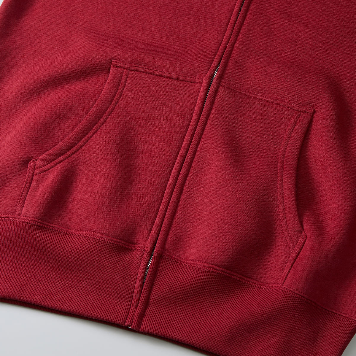 着脱が容易なフルジップタイプは、屋内外のアウターとして重宝!裏地はふかふかで保温性の高い裏起毛にしながら、T/C(綿×ポリエステル)の生地にすることで軽くて丈夫なスウェットに仕上げました。表面を綿100%で組成してあるので、プリント加工にも最適。