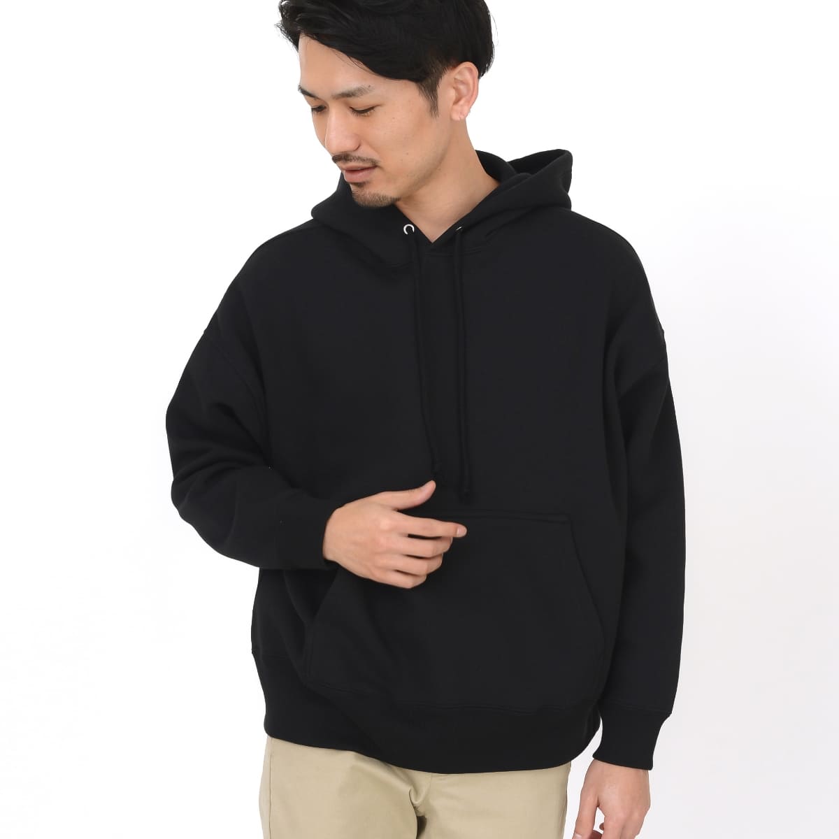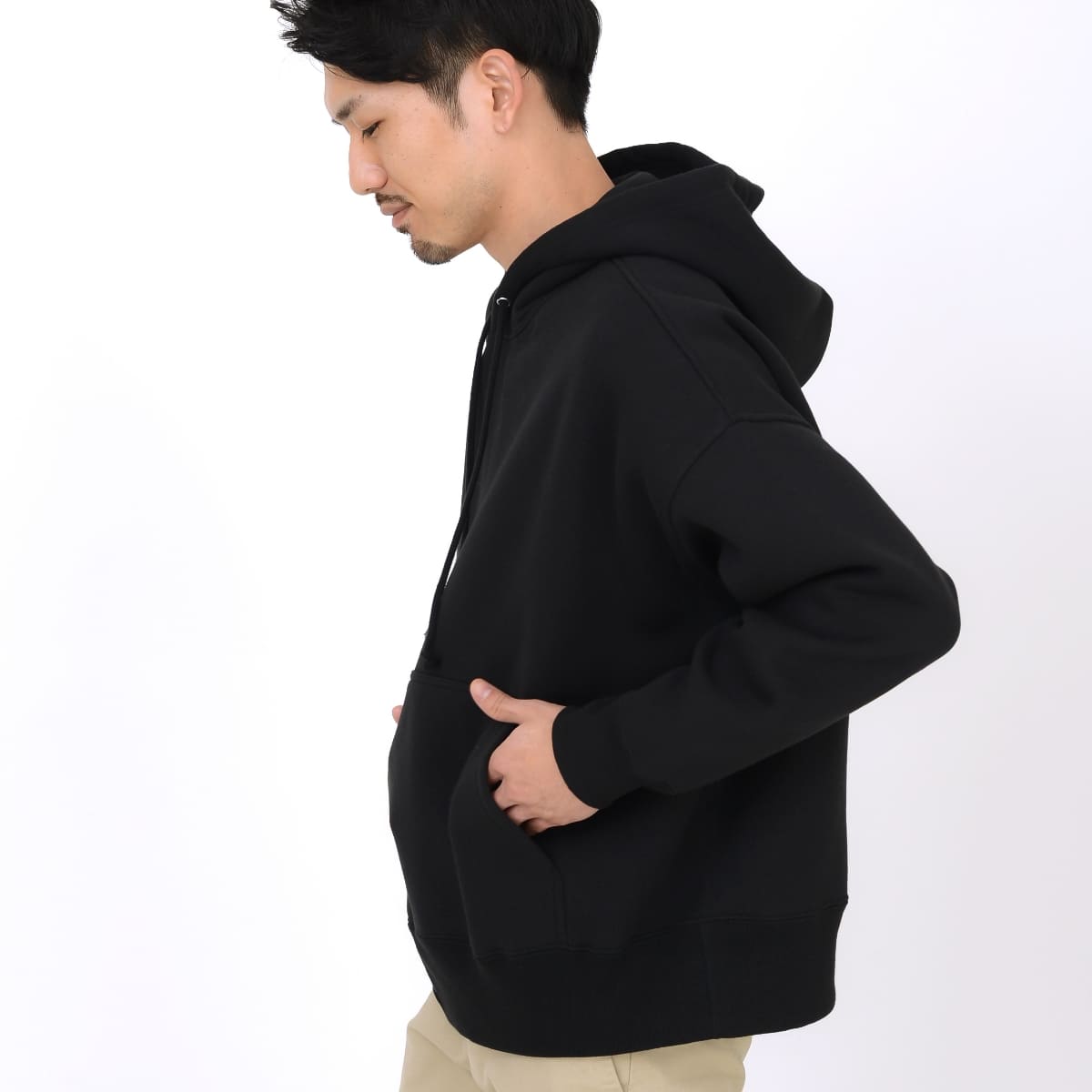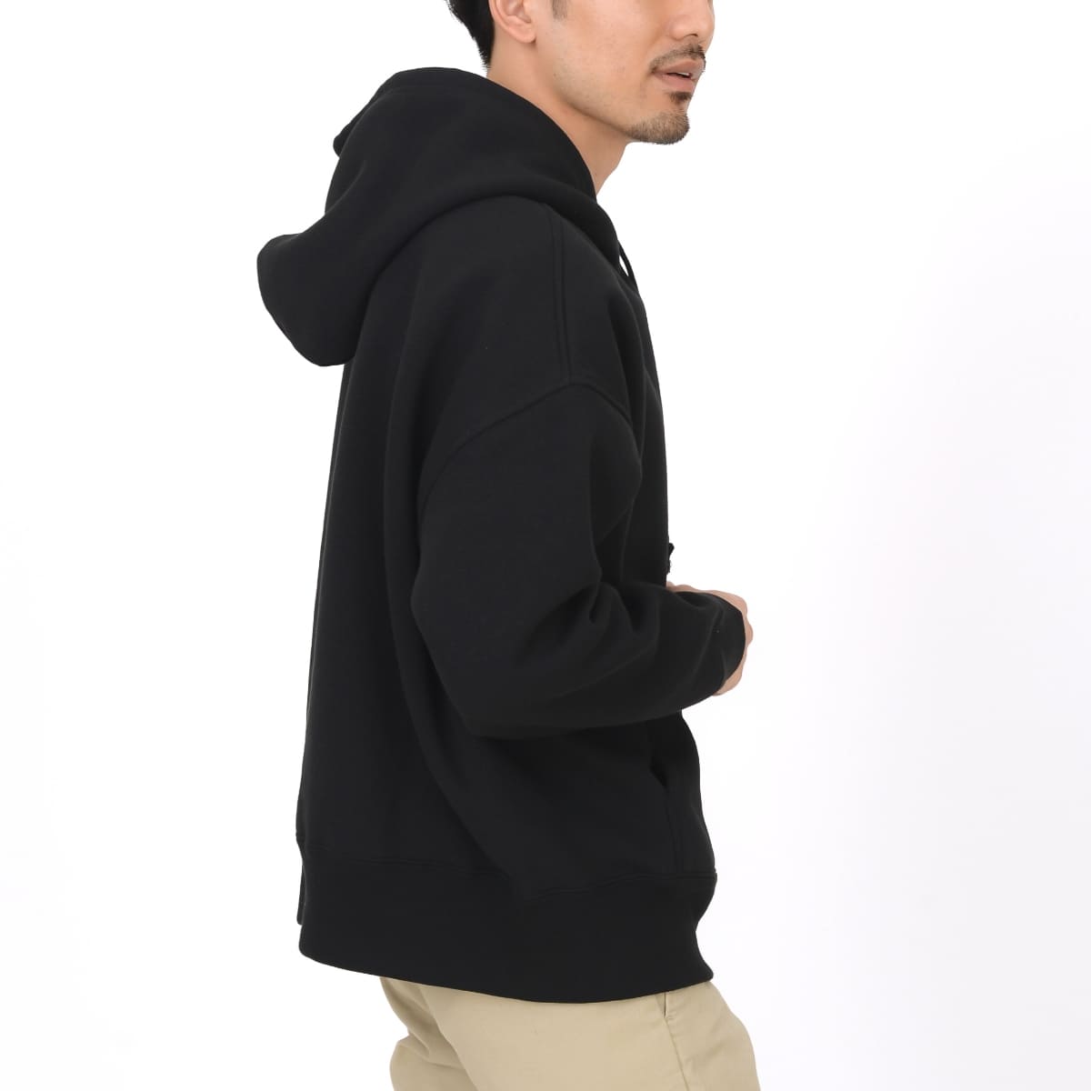 単純にサイズを大きくするのではなく、広めにとった身幅と絶妙な肩落ち具合が織りなすオーバーサイズ感はビッグシルエット好きには必見。また、大きめなフードは立体的なシルエットを保ち、存在感のある仕上がりになるよう型紙から調整。素材は、しっかりと厚みがあり保温力抜群の裏起毛。大好評の5627-01のフーディータイプです。