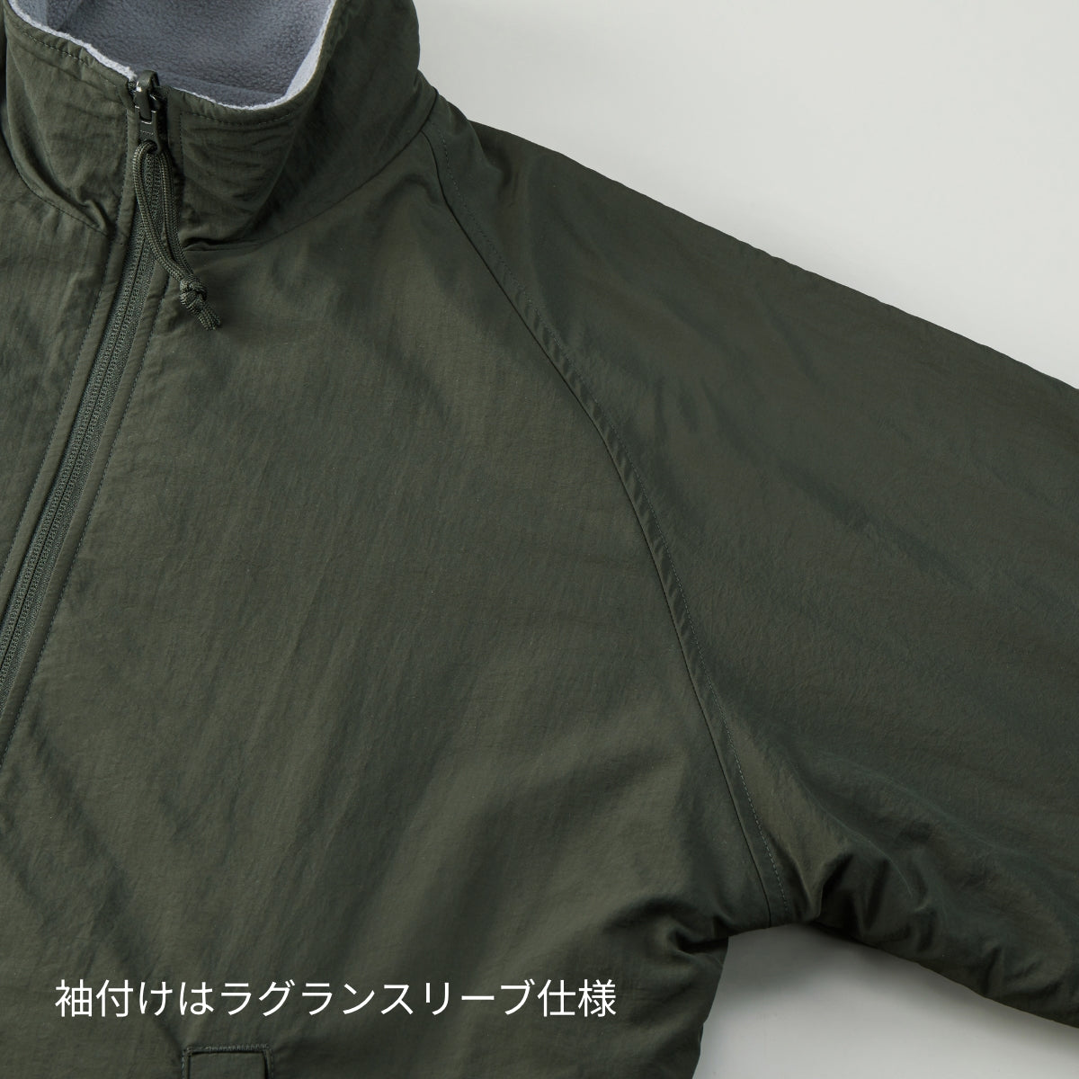 リバーシブル仕様で汎用性抜群のスタンドジャケット。ナイロン側を表にすればシンプルでスポーティーな雰囲気、フリース側を表にすれば、ゴープコアな雰囲気が楽しめる優れもの。どちらの面もゆったりとしたサイジングで着用できるラグラン仕様。フロントのジッパー部分は両面使えるYKK社製の回転オートマチックスライダーを採用し、目を引くパラコードの引き手がポイント。シャーリングの袖口は、フリースサイドで着たときに袖口からナイロン部分が覗いてアクセントになるように設計しています。また裾口にはドローコードを配し、お好みのシルエットに変えることも可能。気分に合わせて楽しめる、変幻自在のアウターです。