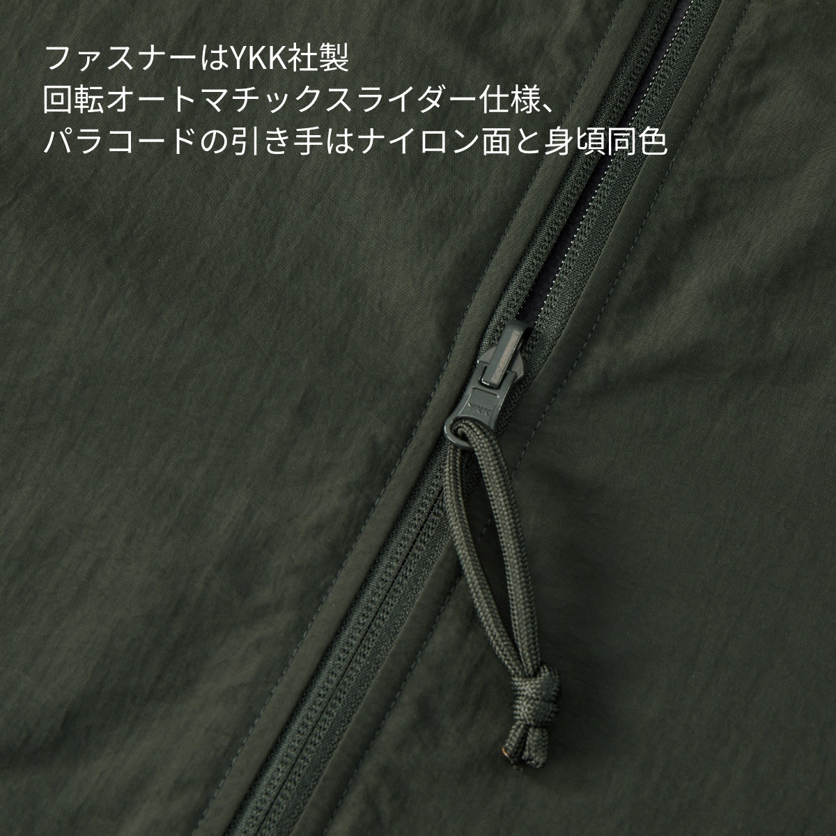 ![]() ファスナーはYKK社製 回転オートマチックスライダー仕様、パラコードの引き手はナイロン面と身頃同色 | ![]() サイドには片玉縁ポケット付き(ナイロン面) |
