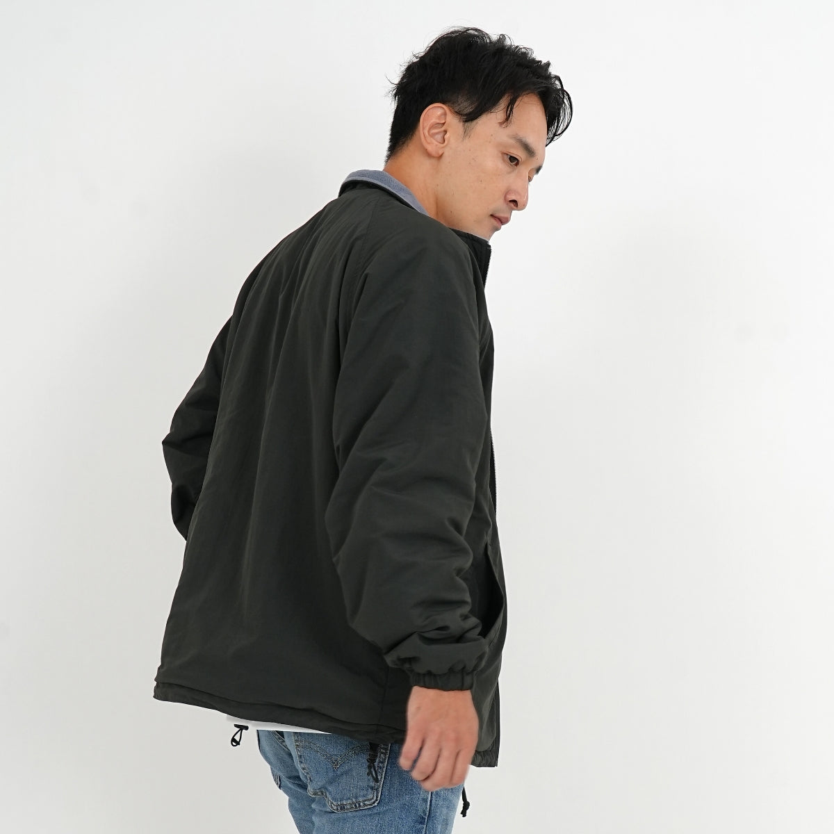 リバーシブル仕様で汎用性抜群のスタンドジャケット。ナイロン側を表にすればシンプルでスポーティーな雰囲気、フリース側を表にすれば、ゴープコアな雰囲気が楽しめる優れもの。どちらの面もゆったりとしたサイジングで着用できるラグラン仕様。フロントのジッパー部分は両面使えるYKK社製の回転オートマチックスライダーを採用し、目を引くパラコードの引き手がポイント。シャーリングの袖口は、フリースサイドで着たときに袖口からナイロン部分が覗いてアクセントになるように設計しています。また裾口にはドローコードを配し、お好みのシルエットに変えることも可能。気分に合わせて楽しめる、変幻自在のアウターです。