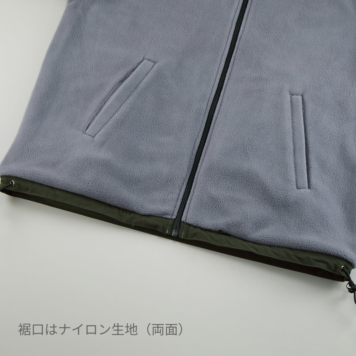 ![]() サイドには片玉縁ポケット付き(フリース面) | ![]() 裾口はナイロン生地(両面) |