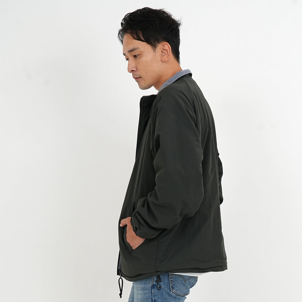 リバーシブル仕様で汎用性抜群のスタンドジャケット。ナイロン側を表にすればシンプルでスポーティーな雰囲気、フリース側を表にすれば、ゴープコアな雰囲気が楽しめる優れもの。どちらの面もゆったりとしたサイジングで着用できるラグラン仕様。フロントのジッパー部分は両面使えるYKK社製の回転オートマチックスライダーを採用し、目を引くパラコードの引き手がポイント。シャーリングの袖口は、フリースサイドで着たときに袖口からナイロン部分が覗いてアクセントになるように設計しています。また裾口にはドローコードを配し、お好みのシルエットに変えることも可能。気分に合わせて楽しめる、変幻自在のアウターです。