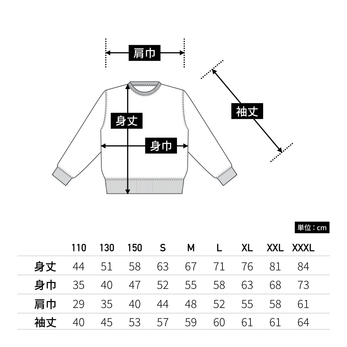 5044-02 トレーナー サイズスペック表
