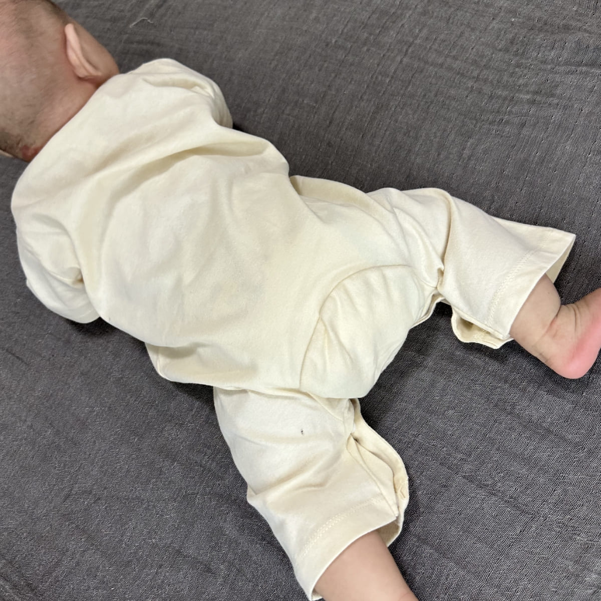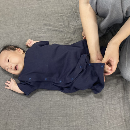 元気に動き回るベビーのお着替えは一苦労ですが、こちらはスナップボタンで全開するので、着替えやオムツ替えも簡単にできます。