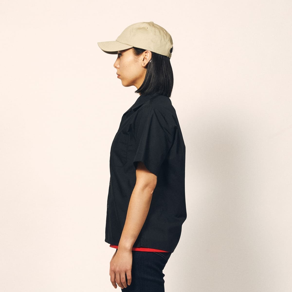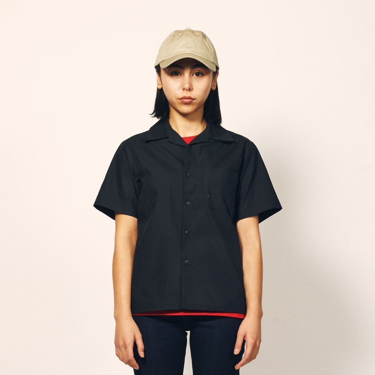 T/Cツイル素材を裏使いし耐久性をそなえ、かろやかさと光沢感がポイントのオープンカラーシャツ
