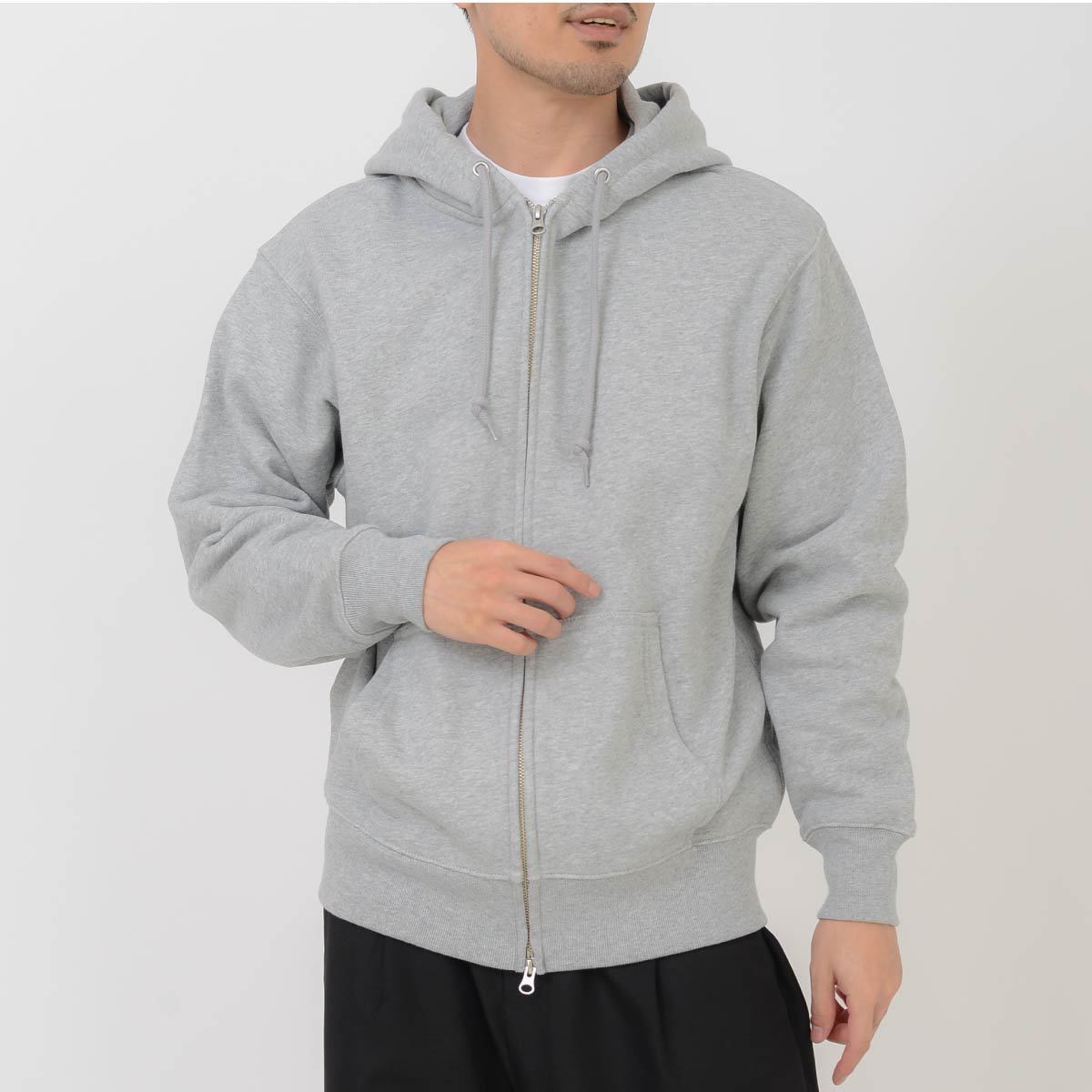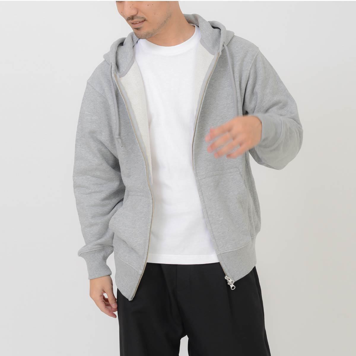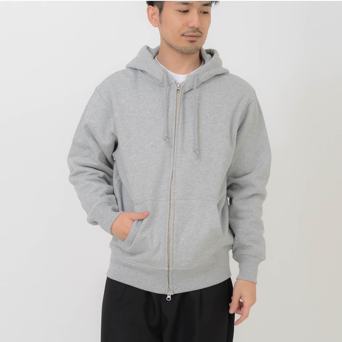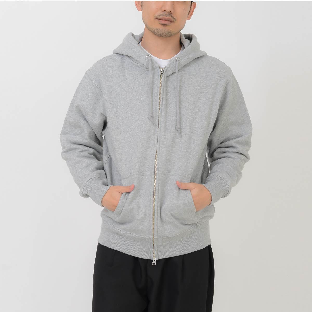 太番手の縫製糸を採用したヘヴィーでしなやかな裏パイルが魅力、ダブルファスナーで脱衣と着まわしを兼ね備えたアウター感覚のジップパーカ