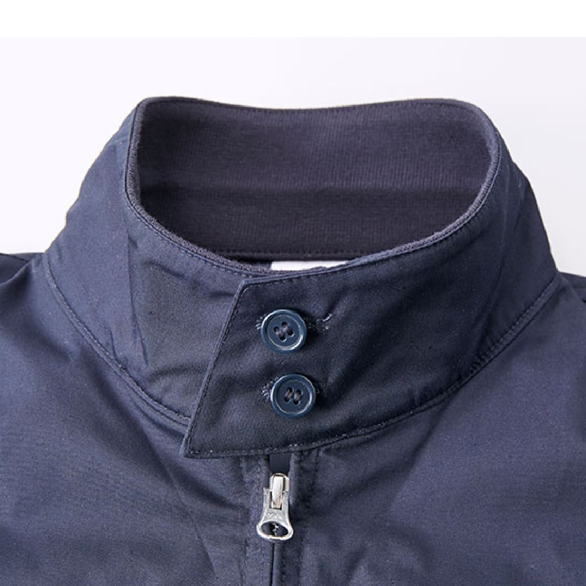 表地は、ポリエステルの耐久性と綿の快適性を兼ね備えた型崩れの少ないT/Cウェザー。立ち襟のリブ使いにより厚みが増した美しいシルエットです。リブは毛玉ができにくく、肌ざわりも滑らか。袖口に備えたカフスボタン2つによる調整が可能で、もたつきを防ぎます。ファスナーはYKK社製シングルスライダー。裏地は身生地と同色で、プリントをおこなう際の加工板が入るふらし仕様となっています。