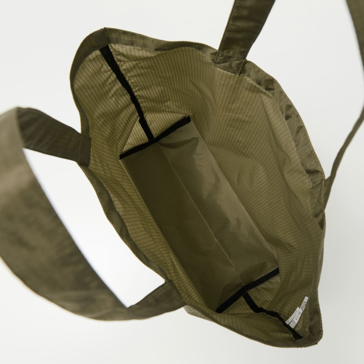 ナイロンのリップストップ生地でつくられた軽量で丈夫なトートバッグ。裏地にアクリルコーティングを施すことで、耐久性をアップ。ミニマルなデザインで、スタイルを選ばずどんな装いにもマッチする万能アイテムに仕上げました。カラーはブラックやネイビーといった定番色だけでなく、ミリタリーやアウトドアカラーも用意。折りたたんでしまっておいて、いざというときのサブバッグとしても活躍します。サステナブルを気にする時代にぴったりなバッグをぜひ相棒にいかがでしょうか。